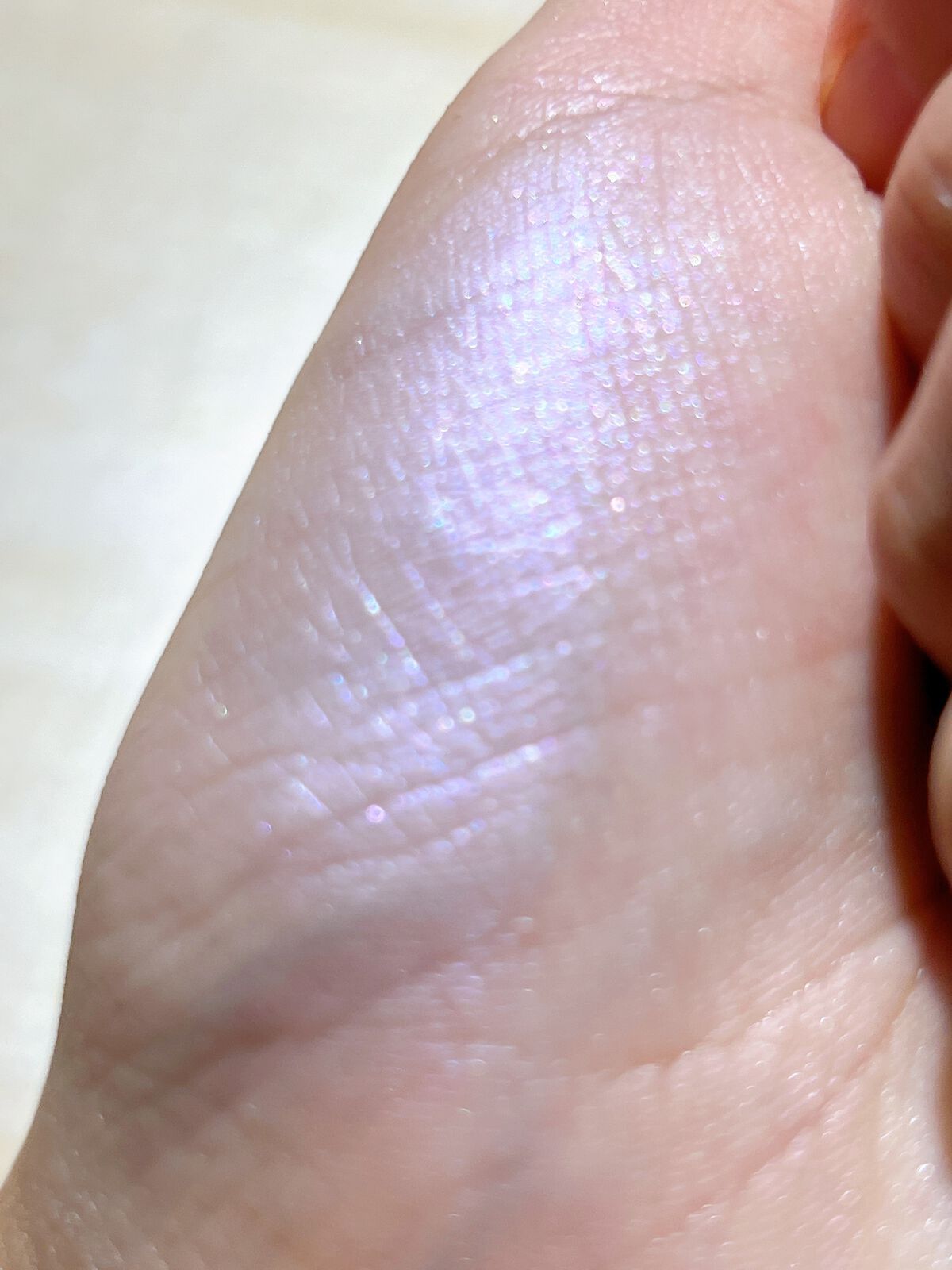 色味が儚く透明感がカワイイすぎ💕 シルバーパールと偏光パープルが入ってるけど、ギラギラしないので使いやすい✨ 付属のブラシもふわふわで使いやすいです👌 ただし、毛穴付近に塗ると悪目立ちする🥺 ハイライトとしてCゾーンに使ってます。 目頭やアイシャドウ、チークに差し色って感じに使うのも有りだと思います👌 付ける量を間違えると儚くなりませんのでご注意して下さい😱