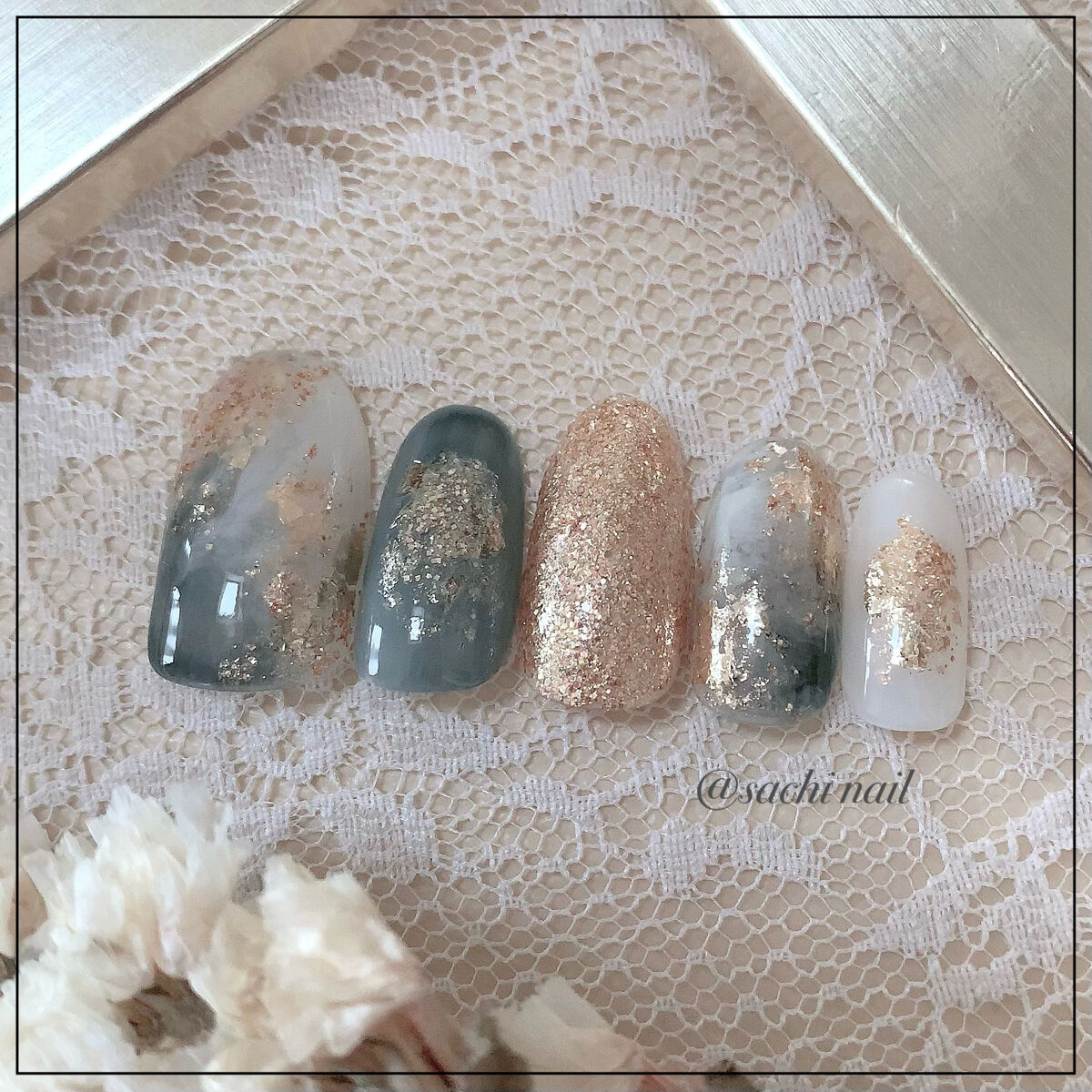 ワンカラーでも指ごとに色を変えるだけでオシャレに見えます💕 画像のようにゴールドラインとストーンを少し足すだけで華やかさがアップ🥰 何度かご紹介したことのあるスポンジで作るグラデーションです✨ スポンジを使うことで境目が綺麗に馴染んでくれます💕 アルミホイルの上でブラウンとトップコートを1:1くらいで混ぜたものを、トップコートのハケに取って3箇所に塗るだけ👌 事前に混ぜたものを塗ることで、爪の上でぼかすより簡単に出来ます💕 ベースカラーが乾く前に点置きしてぼかすことで綺麗にぼかせます✨ スピードが大事なので、使うポリッシュのキャップは全て開けておきましょう😊 天然石のラインはガタガタの方がより天然石っぽく見えるので、ラインを描くのが苦手な方でも大丈夫🙆♀️ 難しそうに見えて、やってみると意外と簡単に出来ます♡