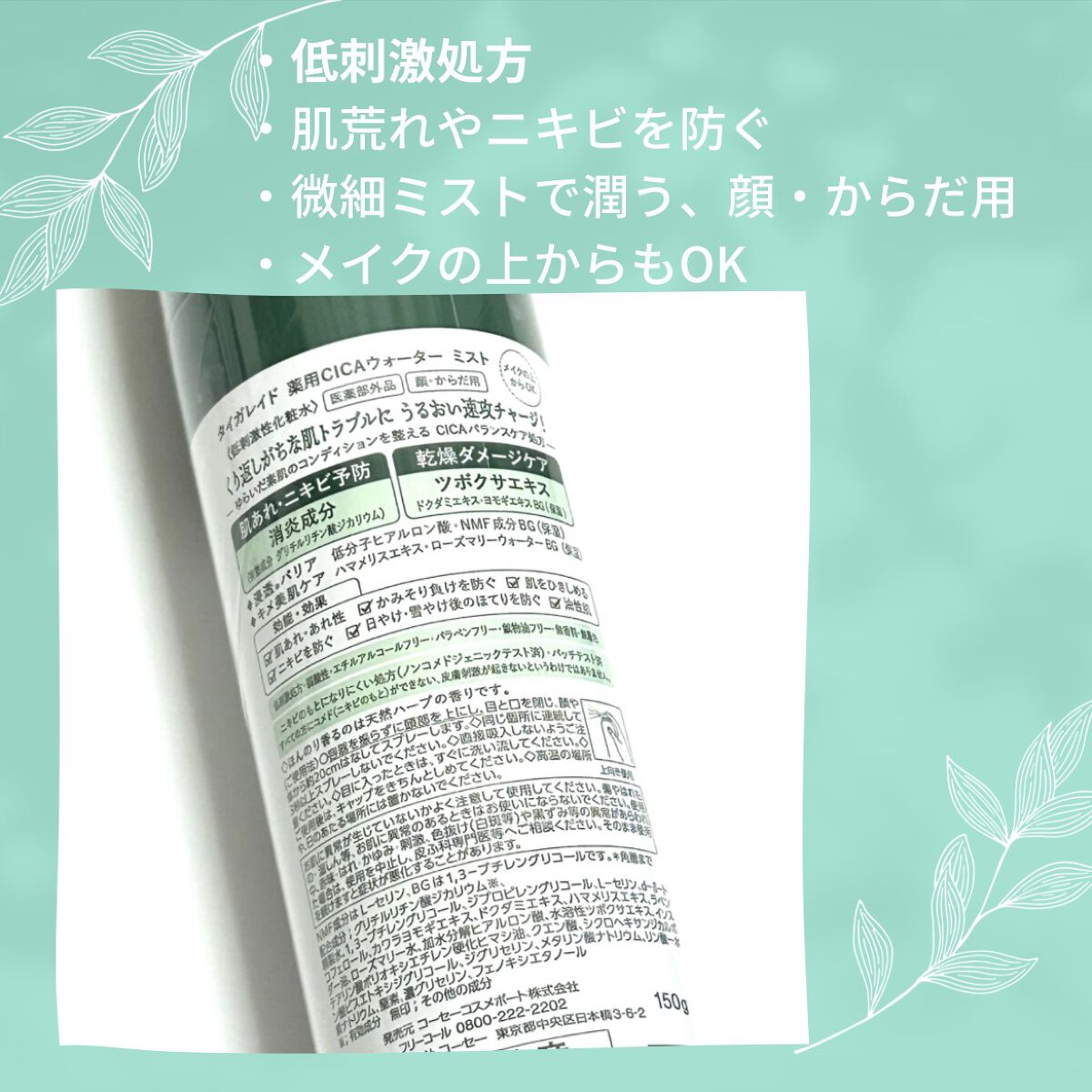 - 【医薬部外品】 ➊肌あれ・ニキビを防いで、すこやかな肌へみちびく薬用CICAミスト 乾燥やゆらぎが気になる肌に。こまめにケアして肌バランスを整え、すこやかな素肌へみちびきます。 ~ゆらいだ素肌のコンディションを整えるCICAバランスケア処方~ ➋あれがちな肌にも毎日使える 低刺激処方 ダメージを受けやすい、あれがちな肌にもやさしい使い心地です。 低刺激処方・弱酸性・エチルアルコールフリー・パラベンフリー・鉱物油フリー・無香料・無着色・ニキビのもとになりにくい処方(ノンコメドジェニックテスト済み)※すべての方にコメド(ニキビのもと)ができない、肌刺激が起きないというわけではありません。 天然ハーブの香りです。 ❸ふんわり微細ミストが角層まで浸透 顔もからだも一気にうるおう! 霧のような微細ミスト。お風呂上りなどでスキンケアはもちろん、日中メイクの上から水分補給にもぴったりです。