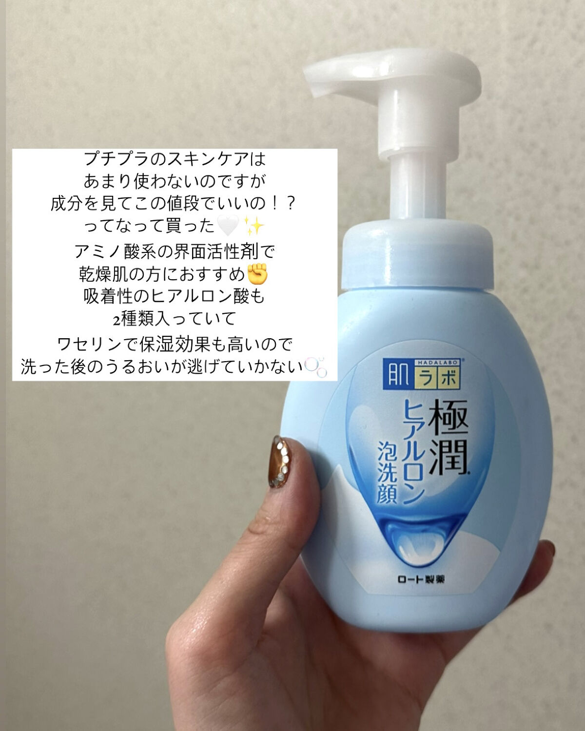 - 「肌ラボ 極潤 ヒアルロン泡洗顔」は、うるおい感と心地よい洗い上がりにこだわった洗顔料です。 3種のヒアルロン酸*1配合の濃密な泡。うるおいを守りながら汚れを落とし、洗うたび健やかなもちもち肌へ導きます。 W洗顔不要でメイクも落とせます*2。 肌へのやさしさに配慮した、無香料・無着色・アルコール(エタノール)フリー・パラベンフリー。 肌ラボは、「肌にいいこと」を突き詰め、健康な素肌を目指す「ヘルススキンケアブランド」です。肌が本当に求めるうるおいを追求すべく、うるおい成分であるヒアルロン酸にこだわり抜き、必要なものはできる限りそぎ落として、デザインも容器もシンプルに。 *1:うるおい成分:ヒアルロン酸ヒドロキシプロピルトリモニウム(肌吸着型ヒアルロン酸) 、アセチルヒアルロン酸Na(スーパーヒアルロン酸)、ヒアルロン酸Na *2:アイメイクなどのポイントメイクには、専用リムーバーのご使用をおすすめします。