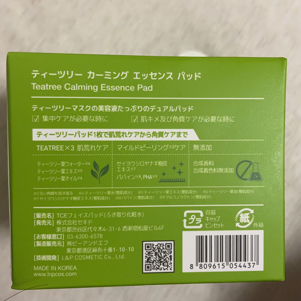 - 肌荒れを予防するティーツリーエッセンス(ティーツリー葉水、ティーツリー葉エキス、ティーツリー葉油の3種類を整肌成分として)を、コットン100%の肌に優しい使い心地のパッドに贅沢にたっぷり配合しております。 片面はエンボスコットン、もう片面がソフトコットンになった「デュアルパッド」になっており、用途に応じての使い分けが可能です。エンボスコットンの面は、手軽に角質・毛穴汚れをオフできる拭き取り化粧水としてお使いいただけます。ソフトコットンの面は、乾燥が気になる部分、肌荒れ予防や集中ケアしたい部分のポイントパックとしてお使いいただけます。 ※2022年9月以降パッケージリニューアル。