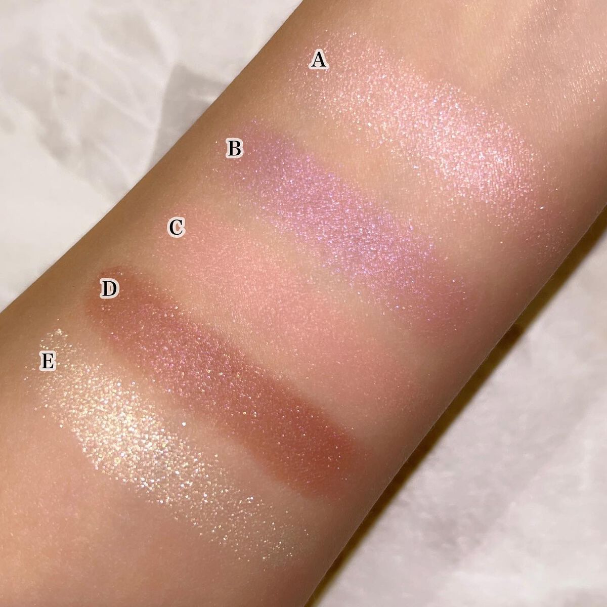 今回の新色は"まぶたに濡れたような光沢を放つ艶、光を操る立体感をプラスしリュクスなまなざしを叶えてくれる"というプリズムフォーミュラ。 確かにいつもとはちょっと違う…良いですこれ🫶❤️ ヌメッと面で光るようなツヤ感✨ テクスチャーは刻印ありタイプ、ツヤはクリームタイプに近いと思います🥰 要は刻印ありとクリームの良いとこ取りですね! ゴールドと柔らかいレッドの組み合わせ。アプレスキーとエレクトリックチェリーの中間のような色合い🤔 ゴールドとピーチカラー。今回の3色の中では一番黄みが強い。 青みがかったローズが可愛い。ぱっと見はわからないけど左上にみんな大好き青ラメが…!!