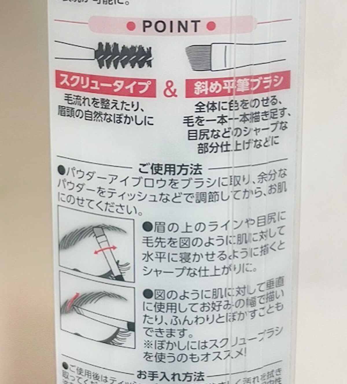 - 眉毛の流れを整え、理想の眉毛を描く、こだわりのダブルエンドアイブロウブラシ。 スクリュータイプ:やわらかな繊維を使用し、お肌にやさしく毛流れを整えたり、アイブロウを自然にぼかします。 斜め平筆ブラシ:コシのある極細繊維を濃密に植え込む事で、繊細な表現が可能に。 全体に色をのせる、毛を一本一本描き足す、目尻などのシャープな部分仕上げなどに適しています。