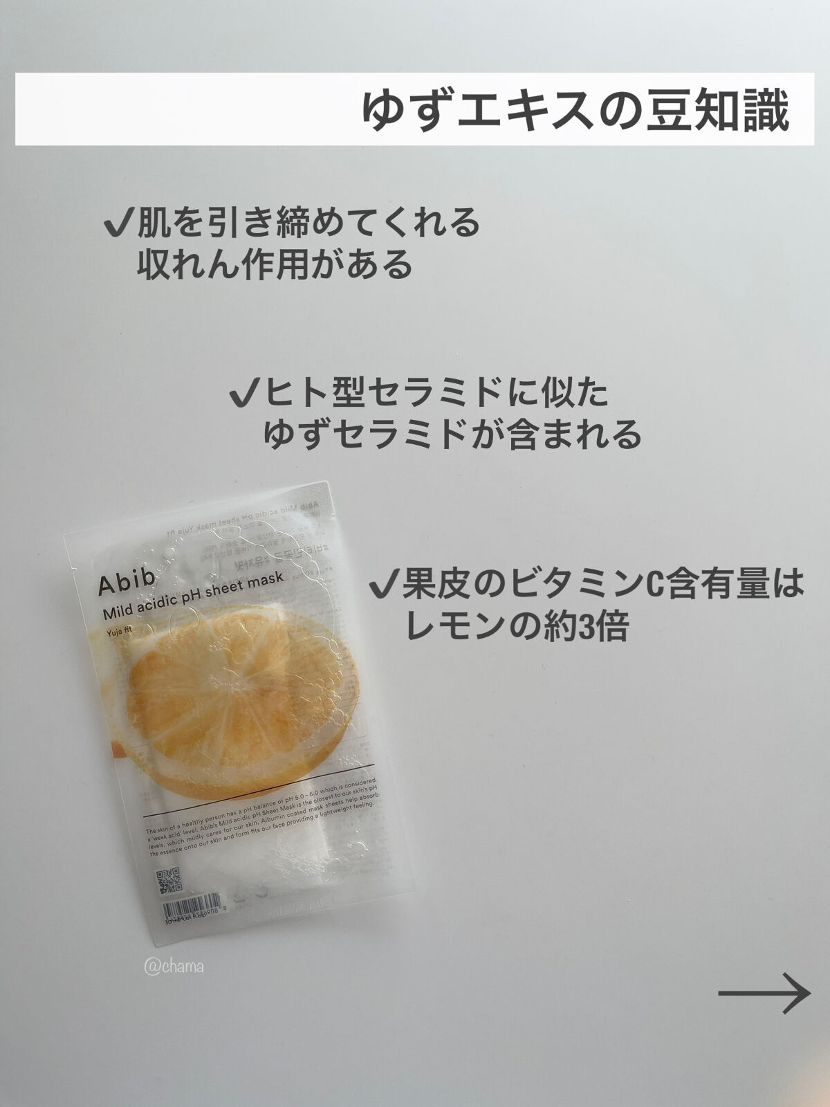 - "肌に最も近いpH数値のパックで低刺激ケア。 柚子を含んだビタミン成分が角質層へ素早く浸透し、肌のトーンアップに効果的。"