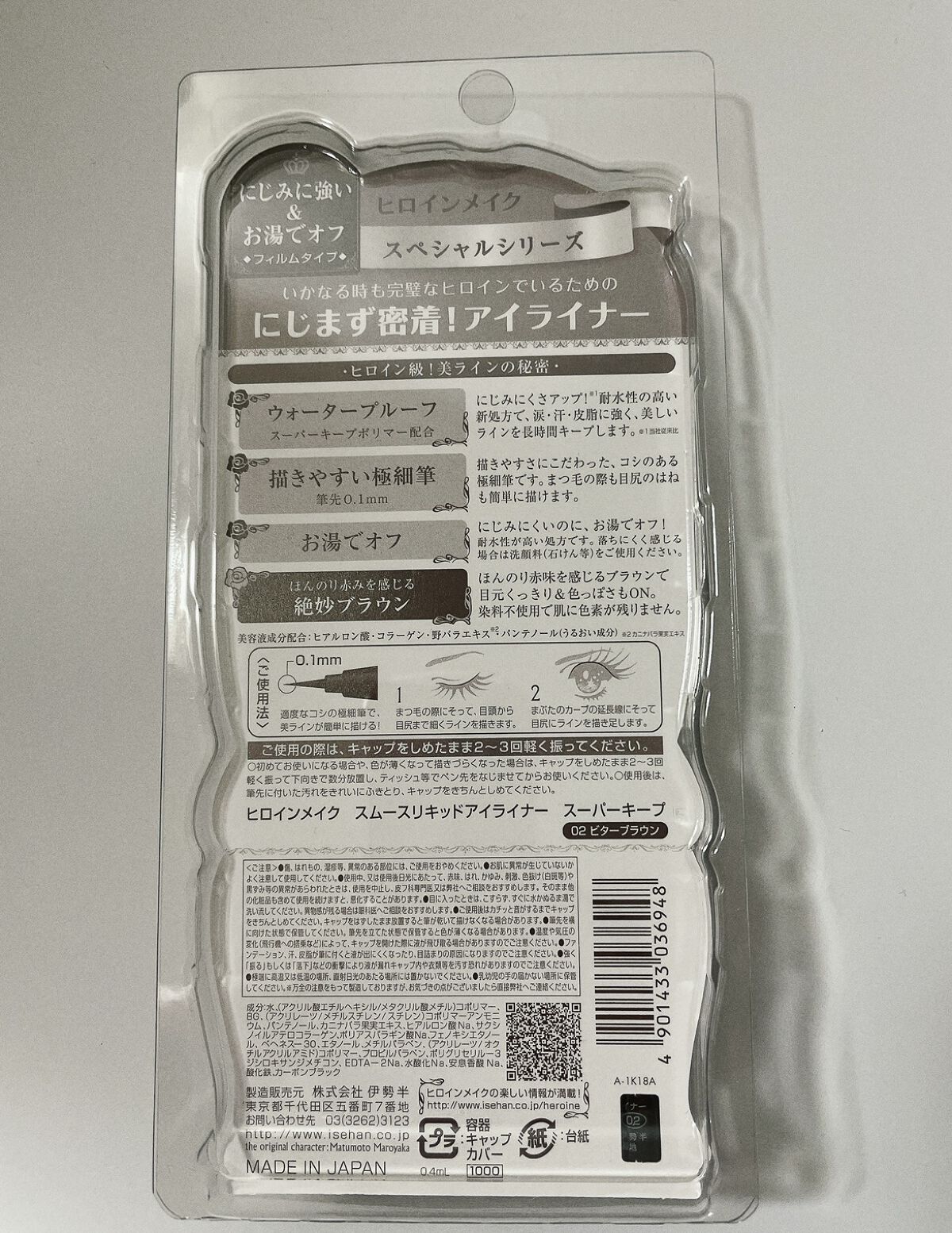ヒロインメイクスムースリキッドアイライナースーパーキープ02ビターブラウン耐久性の高い処方でウォータープルーフで涙・汗・皮脂に強く美しいラインを長時間キープお湯オフというから買ってみたぁ細筆で描きやすい抜け感があるのでブラウン系、好きまぁまぁ...