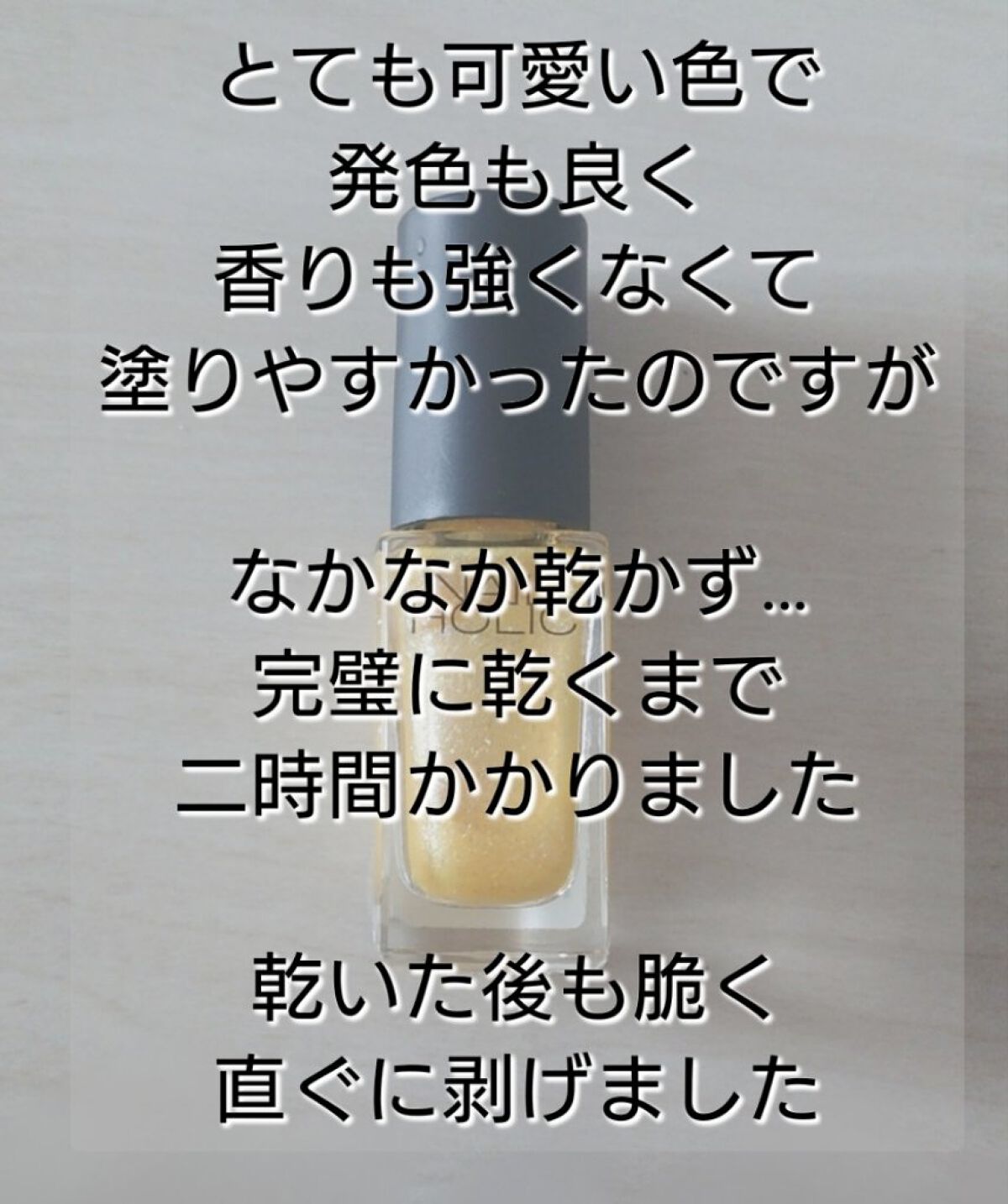 ボトルで見るより明るめのゴールド。メタリックな輝きが効いてる。【使った商品】ネイルホリックDarkFantasyColorGD036【使用感】ひと塗りでしっかり発色&下の色を覆い隠すカバー力。この価格帯だと液がもたっとしてることも多いんですが...
