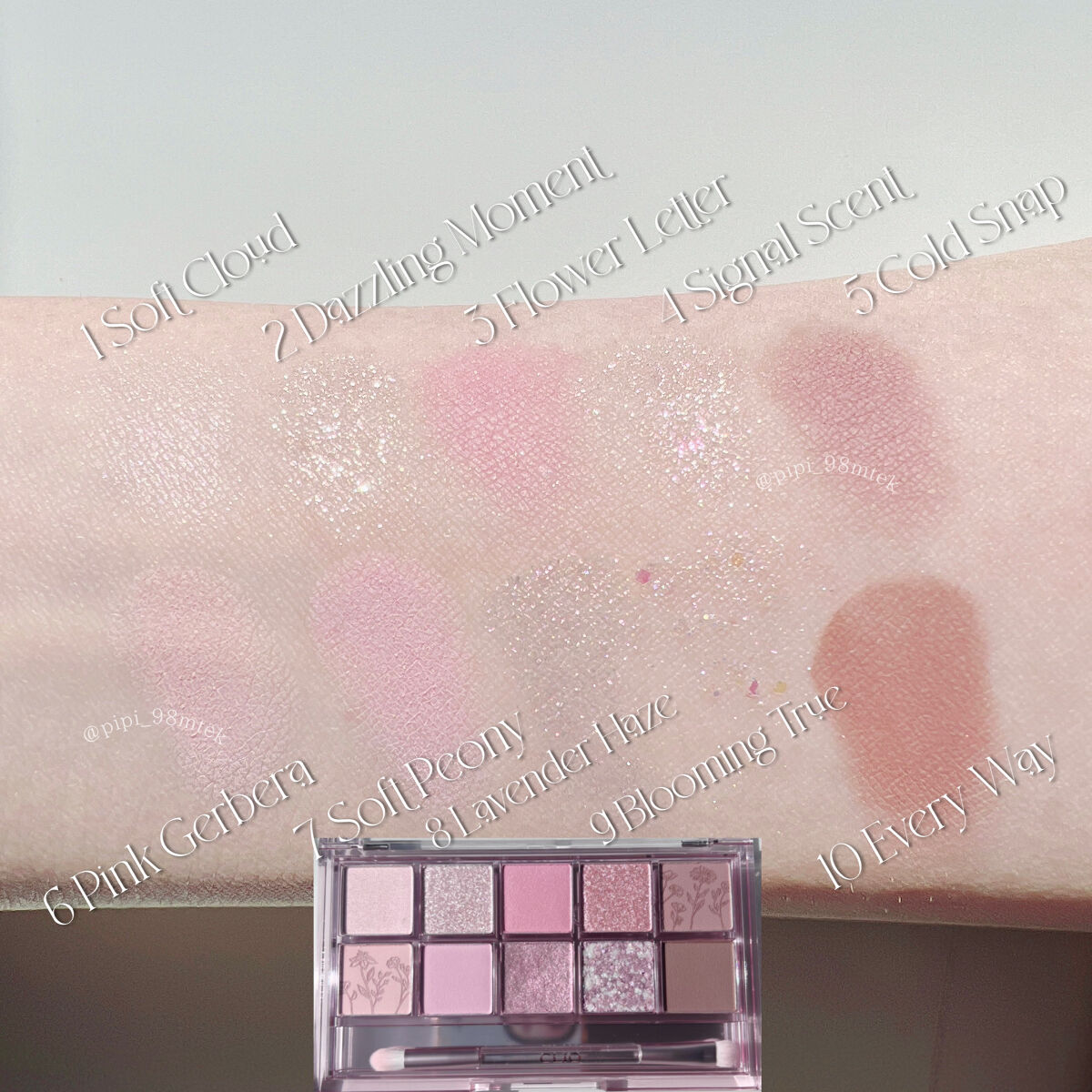 - ひとつのパレットにマット、シマー、グリッターなど多様な質感を贅沢に使用。塗る順序やカラーの組み合わせを変えるだけでデイリーメイクにも、特別な日のお出かけメイクにもできる優れもの。また粉飛びせず、まぶたにしっかり密着します。