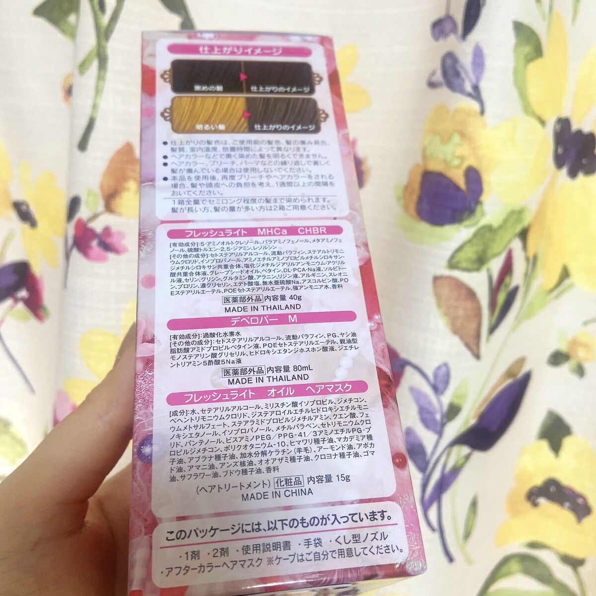 - <ロイヤルブラウン> フレッシュライト MHCa ROBR[有効成分]:塩酸2,4‐ジアミノフェノキシエタノール、パラアミノフェノール、メタアミノフェノール、硫酸トルエン‐2,5‐ジアミン、レゾルシン [その他の成分]:セトステアリルアルコール、流動パラフィン、ステアルトリモニウムクロリド、イソプロパノール、アミノエチルアミノプロピルメチルシロキサン・ジメチルシロキサン共重合体、塩化ジメチルジアリルアンモニウム・アクリル酸共重合体液、グレープシードオイル、ベタイン、DL‐PCA・Na液、ソルビトール液、セリン、グリシン、グルタミン酸、アラニン、リジン液、アルギニン、スレオニン、プロリン、濃グリセリン、エデト酸塩、無水亜硫酸Na、アスコルビン酸、POEステアリルエーテル、POEセトステアリルエーテル、強アンモニア水、香料 デベロパー M[有効成分]:過酸化水素水 [その他の成分]:セトステアリルアルコール、流動パラフィン、PG、ヤシ油脂肪酸アミドプロピルベタイン液、POEセトステアリルエーテル、親油型モノステアリン酸グリセリル、ヒドロキシエタンジホスホン酸液、ジエチレントリアミン5酢酸5Na液 フレッシュライト オイル ヘアマスク 成分:水、セテアリルアルコール、ミリスチン酸イソプロピル、ジメチコン、ベヘントリモニウムクロリド、ジステアロイルエチルヒドロキシエチルモニウムメトサルフェート、ステアラミドプロピルジメチルアミン、クエン酸、フェノキシエタノール、イソプロパノール、メチルパラベン、セトリモニウムクロリド、パンテノール、ビスアミノPEG/PPG‐41/3アミノエチルPG‐プロピルジメチコン、ポリクオタニウム‐10、ヒマワリ種子油、マカデミア種子油、アブラナ種子油、加水分解ケラチン(羊毛)、アーモンド油、アボカド油、アマニ油、アンズ核油、オオアザミ種子油、クロヨナ種子油、ゴマ油、サフラワー油、ブドウ種子油、香料 <チャコールグレージュ> フレッシュライト MHCa CHG[有効成分]:塩酸2,4‐ジアミノフェノキシエタノール、パラアミノフェノール、硫酸トルエン‐2,5‐ジアミン、レゾルシン その他の成分:セトステアリルアルコール、流動パラフィン、ステアルトリモニウムクロリド、イソプロパノール、アミノエチルアミノプロピルメチルシロキサン・ジメチルシロキサン共重合体、塩化ジメチルジアリルアンモニウム・アクリル酸共重合体液、グレープシードオイル、ベタイン、DL‐PCA・Na液、ソルビトール液、セリン、グリシン、グルタミン酸、アラニン、リジン液、アルギニン、スレオニン、プロリン、濃グリセリン、エデト酸塩、無水亜硫酸Na、アスコルビン酸、POEステアリルエーテル、POEセトステアリルエーテル、強アンモニア水、香料 デベロッパー Ma[有効成分]:過酸化水素水 その他の成分:セトステアリルアルコール、流動パラフィン、PG、ヤシ油脂肪酸アミドプロピルベタイン液、フェノキシエタノール、POEセトステアリルエーテル、親油型モノステアリン酸グリセリル、ピロリン酸Na、ヒドロキシエタンジホスホン酸液 リペア ヘアトリートメント 成分:水、セテアリルアルコール、ミリスチン酸イソプロピル、ジメチコン、アモジメチコン、ベヘントリモニウムクロリド、ジステアロイルエチルヒドロキシエチルモニウムメトサルフェート、ステアルジモニウムヒドロキシプロピル加水分解ケラチン(羊毛)、加水分解ケラチン(羊毛)、アマナズナ種子油、野菜油、ヒアルロン酸Na、ステアラミドプロピルジメチルアミン、パルミチン酸セチル、フェノキシエタノール、イソプロパノール、メチルパラベン、塩化Mg、ビスアミノPEG/PPG‐41/3アミノエチルPG‐プロピルジメチコン、乳酸、パンテノール、コハク酸、グアーヒドロキシプロピルトリモニウムクロリド、香料 <プレミアムベージュ> フレッシュライト MHCa PRBE[有効成分]:5‐アミノオルトクレゾール、パラアミノフェノール、硫酸トルエン‐2,5‐ジアミン、レゾルシン [その他の成分]:セトステアリルアルコール、流動パラフィン、ステアルトリモニウムクロリド、イソプロパノール、アミノエチルアミノプロピルメチルシロキサン・ジメチルシロキサン共重合体、塩化ジメチルジアリルアンモニウム・アクリル酸共重合体液、グレープシードオイル、ベタイン、DL‐PCA・Na液、ソルビトール液、セリン、グリシン、グルタミン酸、アラニン、リジン液、アルギニン、スレオニン、プロリン、濃グリセリン、エデト酸塩、無水亜硫酸Na、アスコルビン酸、POEステアリルエーテル、POEセトステアリルエーテル、強アンモニア水、香料 デベロッパー Ma[有効成分]:過酸化水素水 その他の成分:セトステアリルアルコール、流動パラフィン、PG、ヤシ油脂肪酸アミドプロピルベタイン液、フェノキシエタノール、POEセトステアリルエーテル、親油型モノステアリン酸グリセリル、ピロリン酸Na、ヒドロキシエタンジホスホン酸液 リペア ヘアトリートメント 成分:水、セテアリルアルコール、ミリスチン酸イソプ