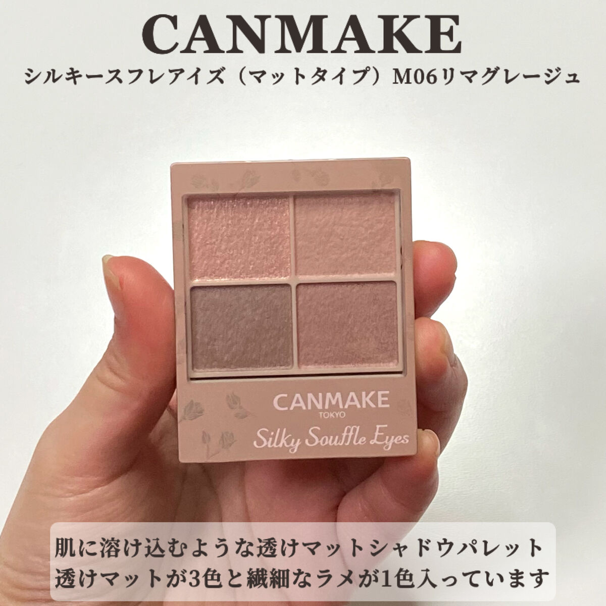 - シルキースフレアイズの姉妹品♡ 肌に溶け込むような透けマットシャドウ 透け感のある柔らかい仕上がりになるマット3色と、透け発色の繊細ラメ1色のパレットシャドウ♡ 完全マットアイや、ラメ×マットアイなど、メイクのパターンを楽しみましょう!