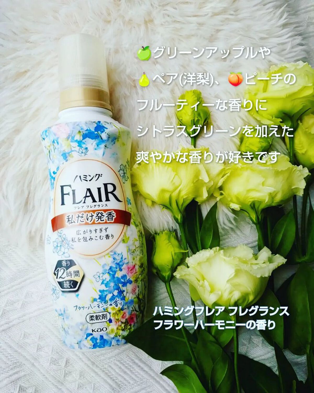-ハミングフレア フラワーハーモニー- 今回紹介するのはハミングフレア フラワーハーモニーです!【商品について】・グリーンアップルとミューゲを加え爽やかな香り・洗たくジワを防ぐや抗菌・防臭効果あり・静電気を防ぐ【使ってみて感じたこと】〇・ふわ...