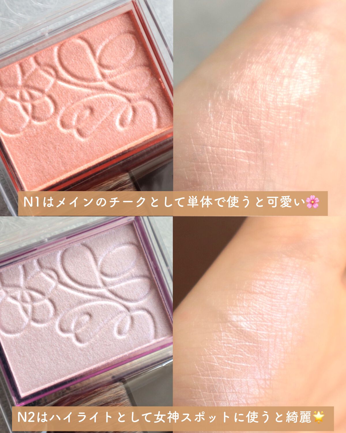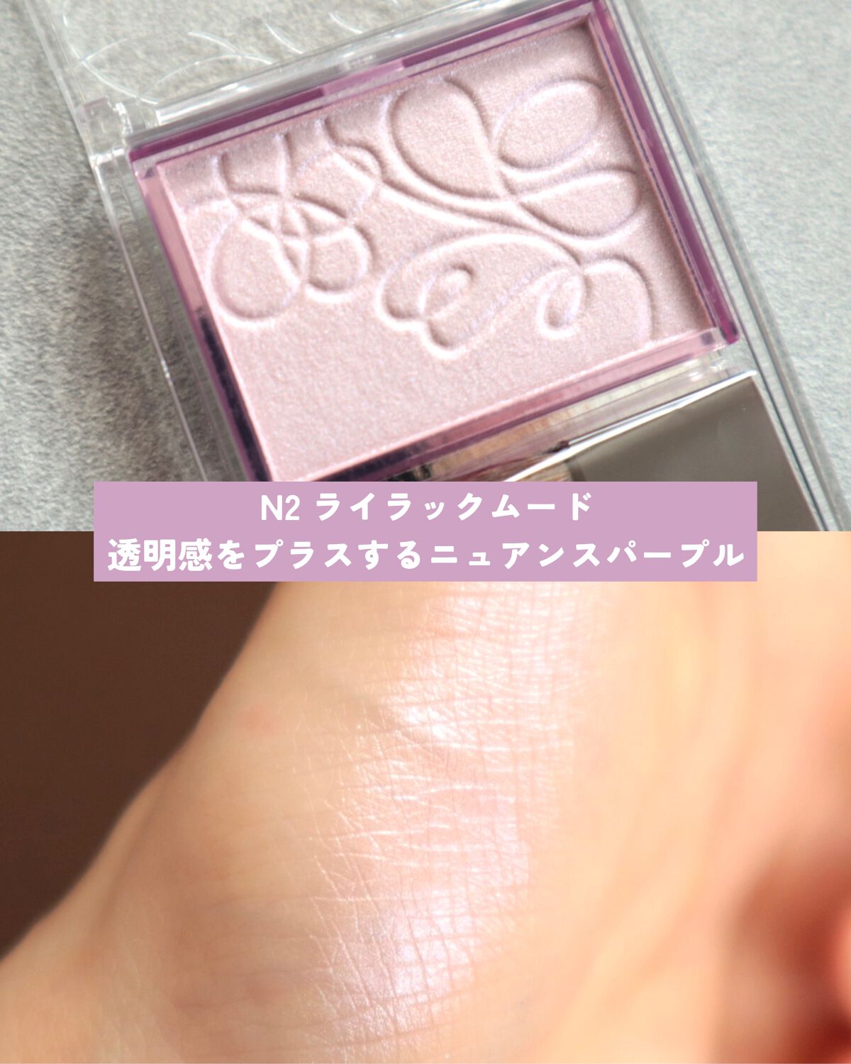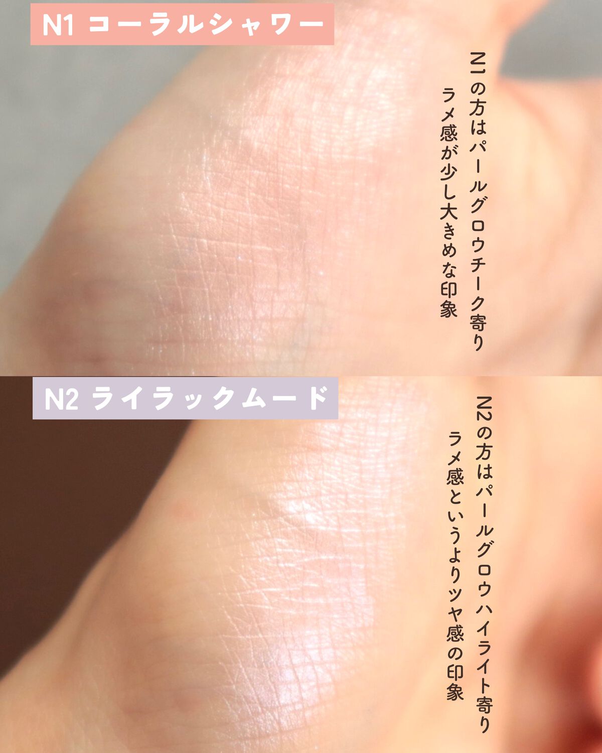 - <N1 コーラルシャワー> トリイソステアリン酸ポリグリセリル-2、トリエチルヘキサノイン、(フッ化/水酸化/酸化)/(Mg/K/ケイ素)、ヘキサ(ヒドロキシステアリン酸/ステアリン酸/ロジン酸)ジペンタエリスリチル、ミリスチン酸亜鉛、(HDI/トリメチロールヘキシルラクトン)クロスポリマー、ペンチレングリコール、ビスジグリセリルポリアシルアジペート-2、フェノキシエタノール、ハイドロゲンジメチコン、メチルパラベン、シリカ、トコフェロール、BG、水、ヒアルロン酸Na、カミツレ花エキス、ラベンダー花エキス、ローズマリー葉エキス、タルク、マイカ、酸化チタン、合成フルオロフロゴパイト、酸化鉄、酸化スズ、赤226、黄4、水酸化Al <N2 ライラックムード> トリイソステアリン酸ポリグリセリル-2、トリエチルヘキサノイン、(フッ化/水酸化/酸化)/(Mg/K/ケイ素)、ヘキサ(ヒドロキシステアリン酸/ステアリン酸/ロジン酸)ジペンタエリスリチル、ミリスチン酸亜鉛、(HDI/トリメチロールヘキシルラクトン)クロスポリマー、ペンチレングリコール、ビスジグリセリルポリアシルアジペート-2、フェノキシエタノール、ハイドロゲンジメチコン、メチルパラベン、シリカ、トコフェロール、BG、水、ヒアルロン酸Na、カミツレ花エキス、ラベンダー花エキス、ローズマリー葉エキス、タルク、合成フルオロフロゴパイト、酸化チタン、マイカ、グンジョウ、酸化スズ、酸化鉄、赤226、水酸化Al