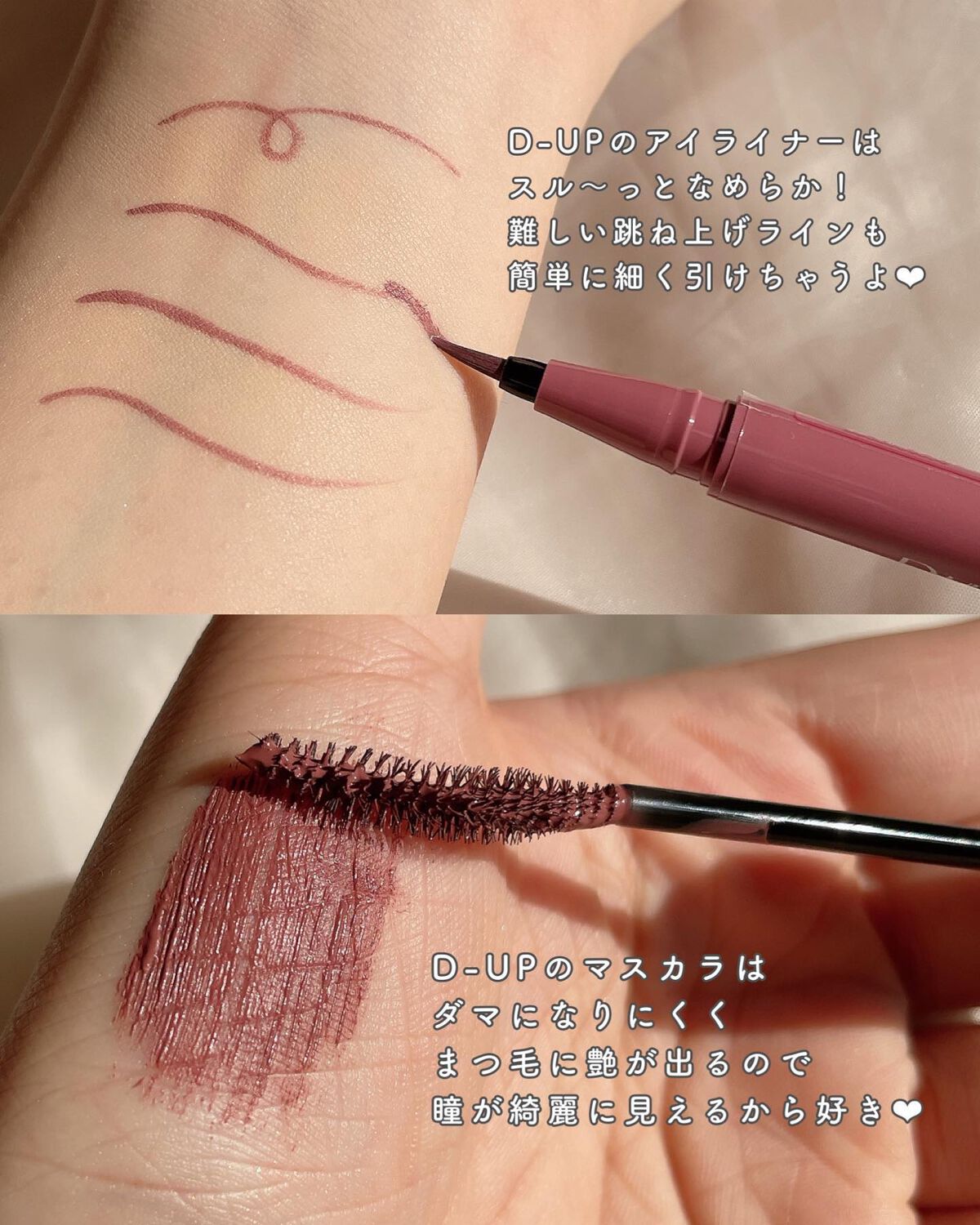 今度の新色は、黄みと赤みを抑えた絶妙な深みグレージュ。0.1mmの極細の筆先で、水や汗やこすれに強くてにじみにくい、リキッドタイプのアイライナー。 重ねると深みが増して目力が増すけど、ほのかに抜け感があります。D-UPのアイライナーはベーシックだけじゃなくて、絶妙なカラーも豊富。 個人的こだわりの筆ペンタイプなのも、オススメのポイントです🤍