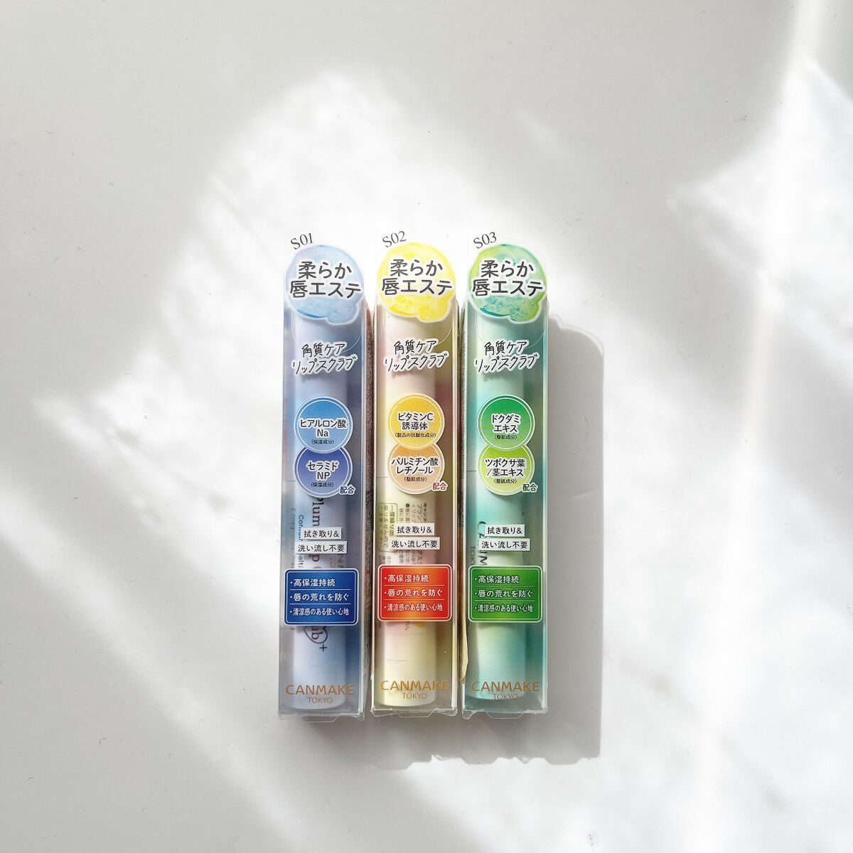 - うれしい成分をプラスした うるおい&角質ケアができるリップスクラブ S01…ヒアルロン酸Na(保湿成分)・セラミドNP(保湿成分) 配合 S02…ビタミンC誘導体(製品の抗酸化成分)・パルミチン酸レチノール(整肌成分) 配合 S03…ドクダミエキス(整肌成分)・ツボクサ葉/茎エキス(整肌成分) 配合 プランプリップケアスクラブに各色2種ずつ成分をプラスしたタイプ。 唇の上で溶けるお砂糖のスクラブが古い角質を優しくオフして、なめらかな唇に整えます。 リップパックした後のような高保湿が持続します。 拭き取り・洗い流し不要なので、外出先でも手軽にケアできます。 ナイトケアにもオススメです。 清涼感のある使い心地 ・スクラブ目的として砂糖の粒子を配合しておりますが、唇の状態によって刺激に感じられる可能性がございますのでご注意ください。 ・強くこすると刺激を感じることがあります。こすりすぎないように注意してください。 ・大変柔らかいバームですので、1㎜程度繰り出してお使いください。 ・一度繰り出したバームは戻りませんのでご注意ください。