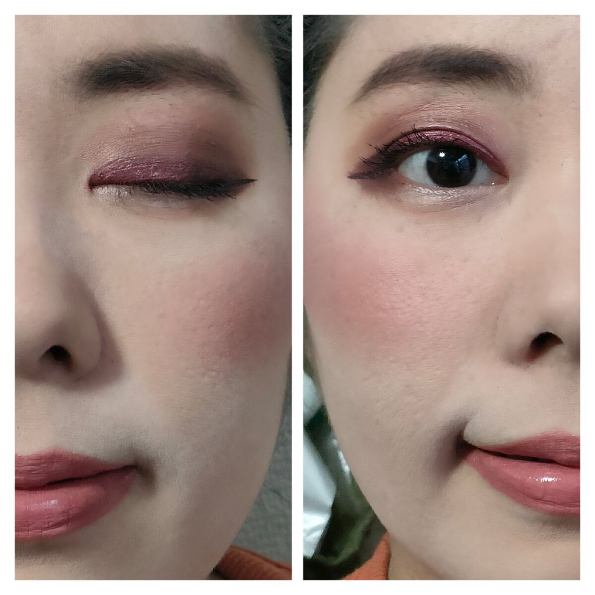 アイシャドウパレットは、URGLAM UR GLAMBLOOMING EYE COLOR PALETTE 02を、使用しました。 マスカラは、MAYBELLINE NEW YORK コロッサルボリュームエクスプレスを、まつ毛全体にまんべんなく塗ります。 リップは、wet 'n' wild MegaLast Lip Colorを、唇全体にまんべんなく塗ります。