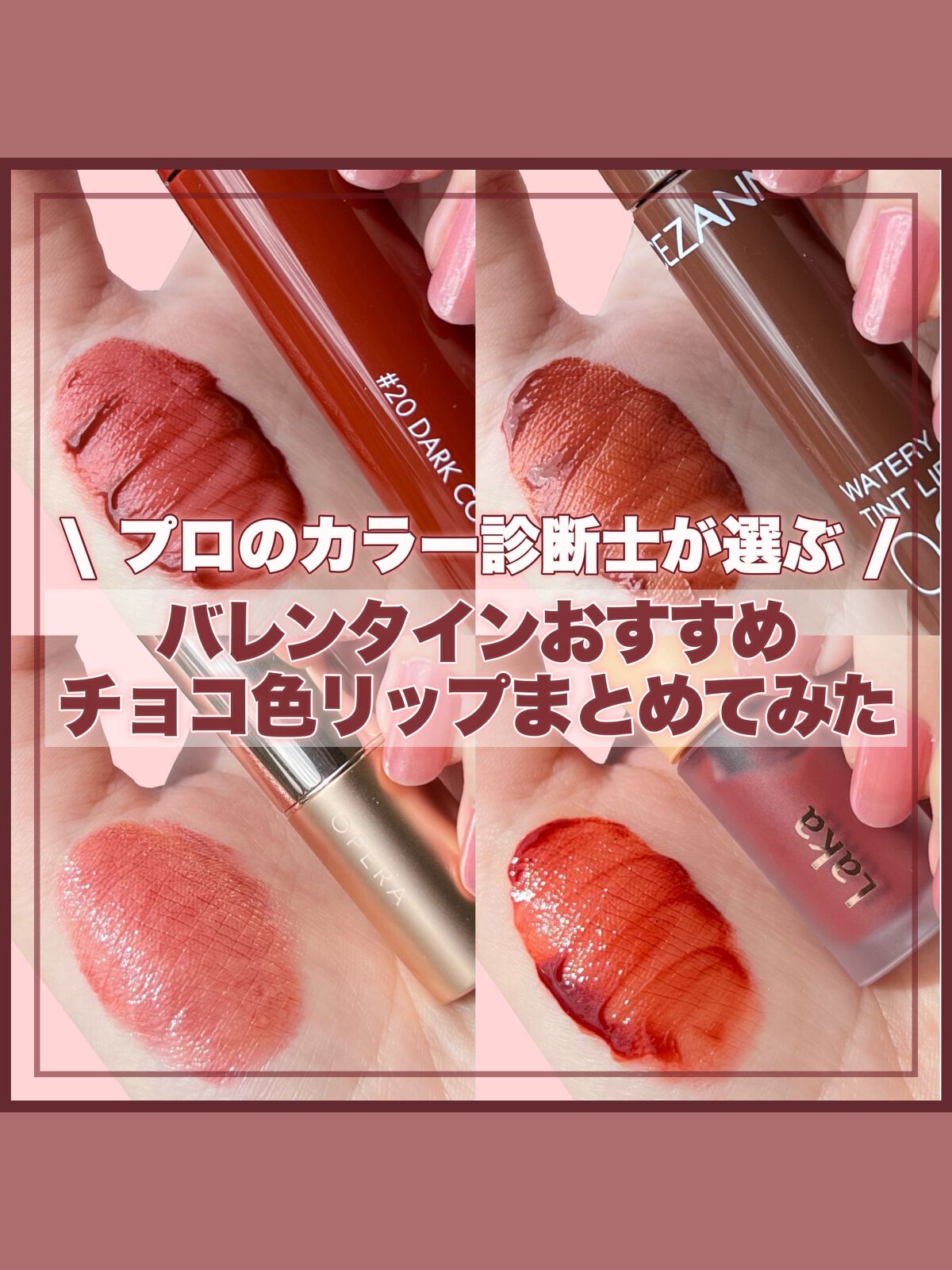薄く唇に密着する新作マットティント。 マットなのにかなりしっとりとしていて 乾燥を感じなくてびっくりでした! 一気にこなれ感が出るトレンドカラーです♡ やや青みの華やかローズレッド 公式画像より鮮やかめに感じました。 やや黄みの強くて深いオレンジレッド ストロングオータムに超激推しです! やや黄みの非常に深く濃いダークブラウン ディープオータムに激推しです! かわいい雰囲気になれるピンクリップです♡ やや青みの柔らかいくすみピンクベージュ ミューテッドサマーにおすすめです! 青みの落ち着いたローズピンク やや青みのとても鮮やかなビビッドレッド ビビッドウィンターに特におすすめ! 既存マットティントよりもさらに ふわふわなマット感が魅力のリップで、 軽くティッシュオフしてもほとんど落ちない◎ マスクにも激推しのティントなので、 ぜひ皆さんもチェックしてみてね❤︎