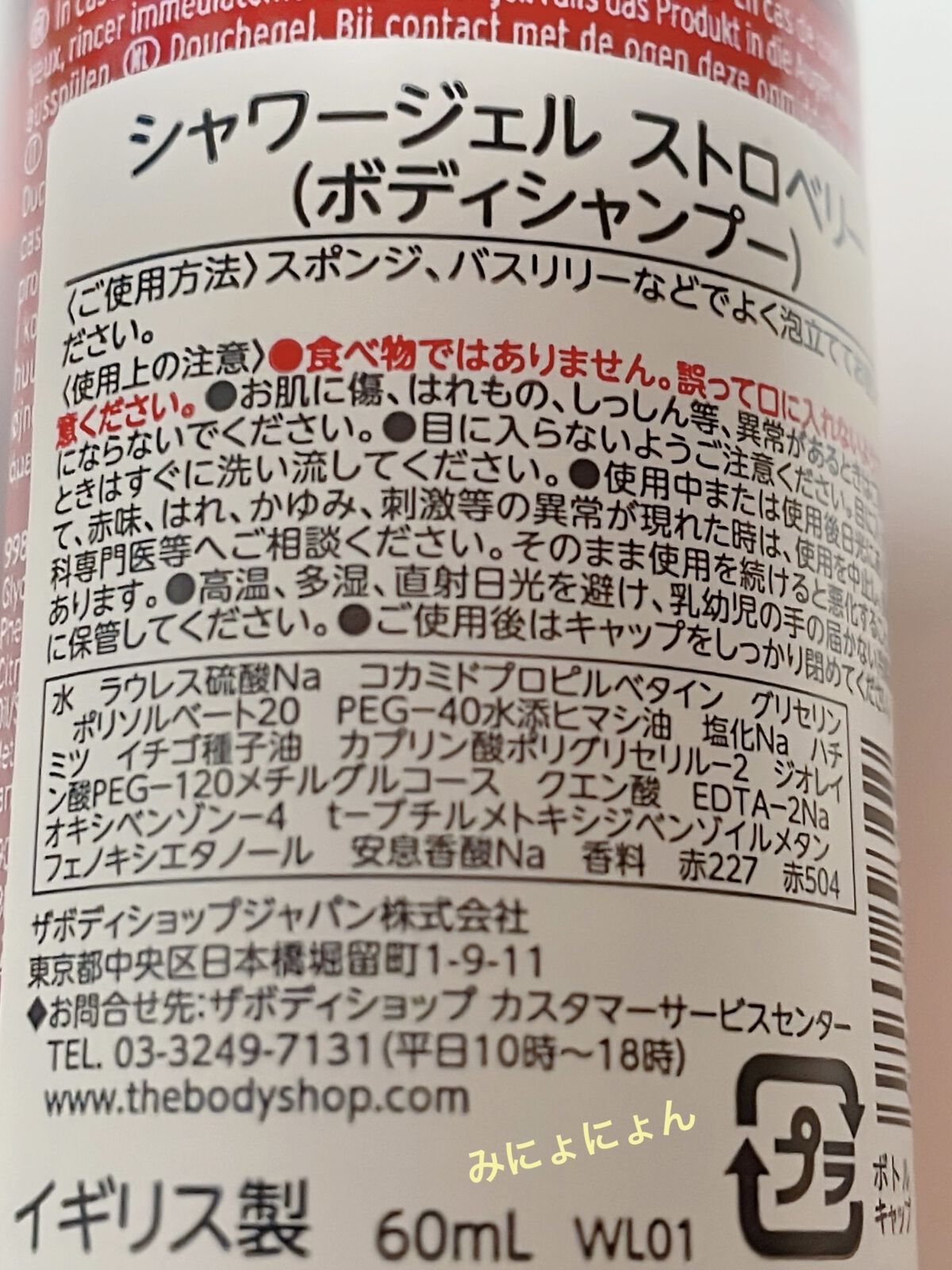 - 水、ラウレス硫酸Na、コカミドプロピルベタイン、グリセリン、ポリソルベート20、PEG - 40水添ヒマシ油、イチゴ種子油、ハチミツ、塩化Na、クエン酸、スルホコハク酸3Na、カプリン酸ポリグリセリル-2、ジオレイン酸PEG-120メチルグルコース、EDTA-2Na、安息香酸デナトニウム、オキシベンゾン-4、t-ブチルメトキシジベンゾイルメタン、フェノキシエタノール、安息香酸Na、香料、赤227、赤504 ※表示されている全成分は改良等の理由により、予告なく処方が変更となり、掲載の原料、説明などが製品のラベルと異なる場合もございます。