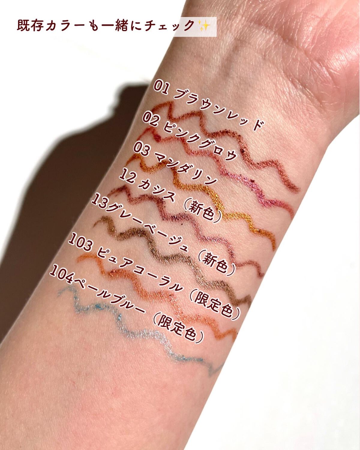 - <01 ブラウンレッド> トリメチルシロキシケイ酸、メチルトリメチコン、マイクロクリスタリンワックス、ミツロウ、シクロペンタシロキサン、(アクリレーツ/アクリル酸ステアリル/メタクリル酸ジメチコン)コポリマー、キャンデリラロウ、トリ(ベヘン酸/イソステアリン酸/エイコサン二酸)グリセリル、ミネラルオイル、合成ワックス、リンゴ酸ジイソステアリル、水添ポリイソブテン、炭酸プロピレン、カルナウバロウ、シメチコン、ジステアルジモニウムヘクトライト、ジメチコン、酸化スズ、酸化チタン、マイカ、酸化鉄、赤202 <02 ピンクグロウ> メチルトリメチコン、トリメチルシロキシケイ酸、マイクロクリスタリンワックス、ミツロウ、シクロペンタシロキサン、(アクリレーツ/アクリル酸ステアリル/メタクリル酸ジメチコン)コポリマー、キャンデリラロウ、トリ(ベヘン酸/イソステアリン酸/エイコサン二酸)グリセリル、合成フルオロフロゴパイト、ミネラルオイル、リンゴ酸ジイソステアリル、合成ワックス、水添ポリイソブテン、シリカ、水酸化Al、炭酸プロピレン、カルナウバロウ、シメチコン、ジステアルジモニウムヘクトライト、ジメチコン、酸化スズ、酸化チタン、マイカ、酸化鉄、赤202 <03 マンダリン> トリメチルシロキシケイ酸、メチルトリメチコン、合成フルオロフロゴパイト、シクロペンタシロキサン、マイクロクリスタリンワックス、ミツロウ、(アクリレーツ/アクリル酸ステアリル/メタクリル酸ジメチコン)コポリマー、キャンデリラロウ、トリ(ベヘン酸/イソステアリン酸/エイコサン二酸)グリセリル、ミネラルオイル、合成ワックス、水添ポリイソブテン、リンゴ酸ジイソステアリル、炭酸プロピレン、カルナウバロウ、シメチコン、ジステアルジモニウムヘクトライト、ジメチコン、酸化スズ、マイカ、酸化鉄 <06 フォグブラウン(復刻限定色)> トリメチルシロキシケイ酸、メチルトリメチコン、シクロペンタシロキサン、マイクロクリスタリンワックス、ミツロウ、(アクリレーツ/アクリル酸ステアリル/メタクリル酸ジメチコン)コポリマー、キャンデリラロウ、トリ(ベヘン酸/イソステアリン酸/エイコサン二酸)グリセリル、ミネラルオイル、合成ワックス、水添ポリイソブテン、リンゴ酸ジイソステアリル、合成フルオロフロゴパイト、炭酸プロピレン、カルナウバロウ、シメチコン、ジステアルジモニウムヘクトライト、ジメチコン、酸化スズ、酸化チタン、マイカ、酸化鉄 <08 トープグレージュ(限定色)> マイカ、トリメチルシロキシケイ酸、メチルトリメチコン、シクロペンタシロキサン、マイクロクリスタリンワックス、ミツロウ、(アクリレーツ/アクリル酸ステアリル/メタクリル酸ジメチコン)コポリマー、キャンデリラロウ、トリ(ベヘン酸/イソステアリン酸/エイコサン二酸)グリセリル、ミネラルオイル、リンゴ酸ジイソステアリル、合成ワックス、水添ポリイソブテン、合成フルオロフロゴパイト、ジステアルジモニウムヘクトライト、炭酸プロピレン、カルナウバロウ、シメチコン、ジメチコン、酸化スズ、酸化チタン、酸化鉄 <09 ヘーゼルグリーン(限定色)> マイカ、トリメチルシロキシケイ酸、メチルトリメチコン、シクロペンタシロキサン、マイクロクリスタリンワックス、ミツロウ、キャンデリラロウ、(アクリレーツ/アクリル酸ステアリル/メタクリル酸ジメチコン)コポリマー、トリ(ベヘン酸/イソステアリン酸/エイコサン二酸)グリセリル、ミネラルオイル、合成ワックス、水添ポリイソブテン、リンゴ酸ジイソステアリル、ジステアルジモニウムヘクトライト、炭酸プロピレン、カルナウバロウ、シメチコン、ジメチコン、酸化スズ、酸化チタン、酸化鉄、コンジョウ <10 グレイッシュモーヴ> マイカ、トリメチルシロキシケイ酸、メチルトリメチコン、シクロペンタシロキサン、マイクロクリスタリンワックス、ミツロウ、(アクリレーツ/アクリル酸ステアリル/メタクリル酸ジメチコン)コポリマー、トリ(ベヘン酸/イソステアリン酸/エイコサン二酸)グリセリル、キャンデリラロウ、ミネラルオイル、水添ポリイソブテン、合成ワックス、ジステアルジモニウムヘクトライト、リンゴ酸ジイソステアリル、合成フルオロフロゴパイト、炭酸プロピレン、カルナウバロウ、コメヌカロウ、シメチコン、ジメチコン、ステアリン酸、パラフィン、トコフェロール、酸化スズ、酸化チタン、酸化鉄、コンジョウ <101 スターリーブルー(限定色)> メチルトリメチコン、トリメチルシロキシケイ酸、シクロペンタシロキサン、マイクロクリスタリンワックス、ミツロウ、リンゴ酸ジイソステアリル、合成ワックス、(アクリレーツ/アクリル酸ステアリル/メタクリル酸ジメチコン)コポリマー、トリ(ベヘン酸/イソステアリン酸/エイコサン二酸)グリセリル、キャンデリラロウ、ミネラルオイル、水添ポリイソブテン、合成フルオロフロゴパイト、ジステアルジモニウムヘクトライト、炭酸プロ