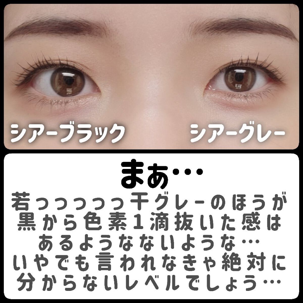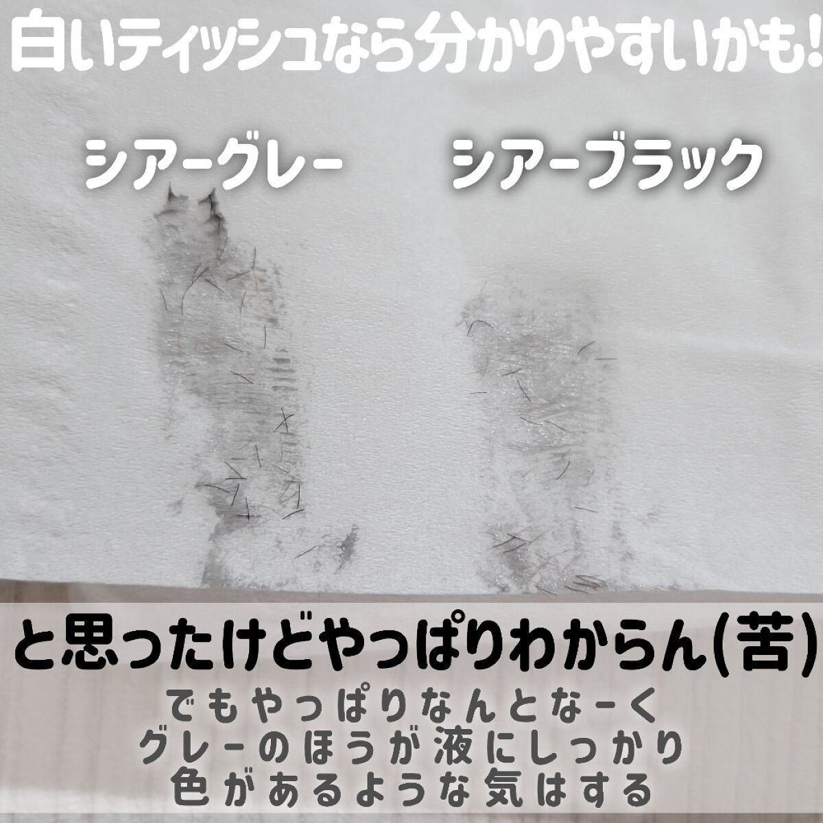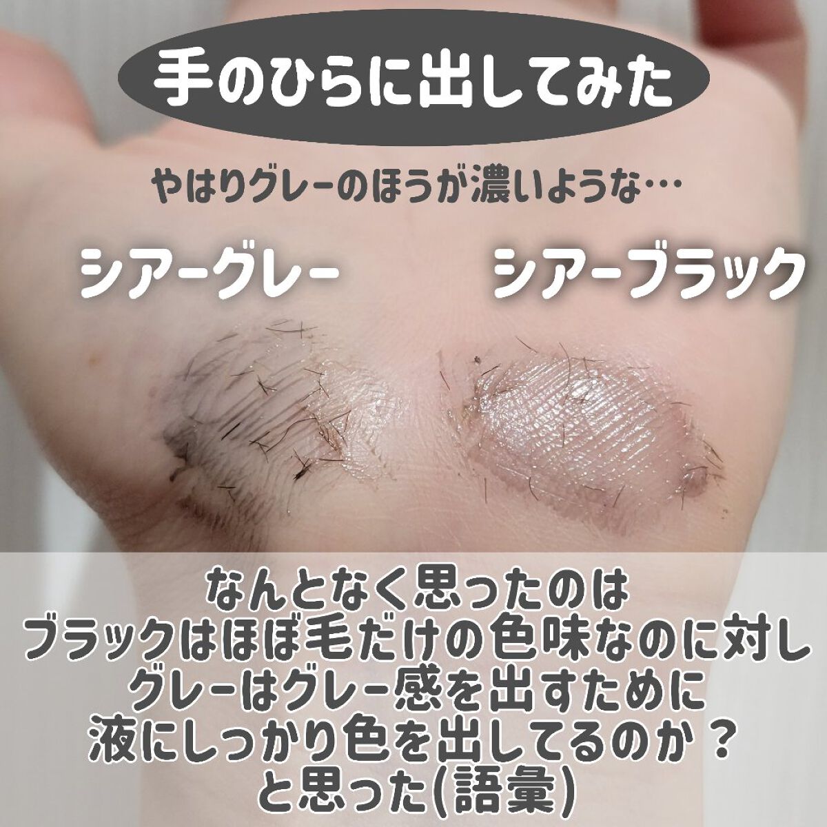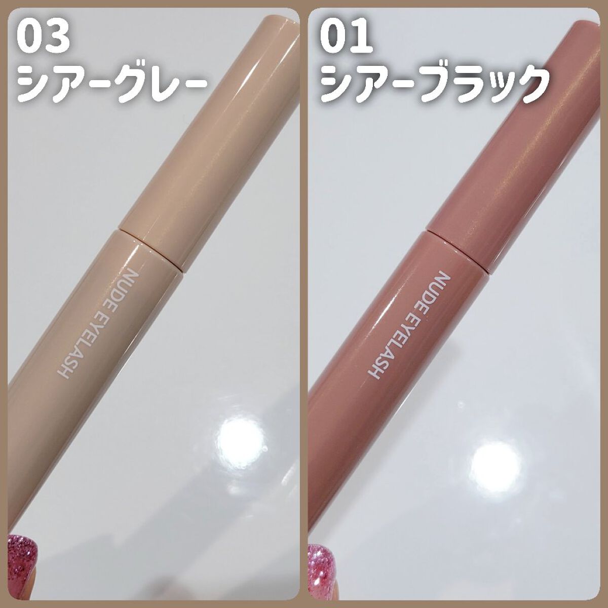 01シアーブラックを初めて使った時に感動し ヌードアイラッシュは基本的に売り切れてるので… 03のシアーグレーをGETしたのですが 太陽に透かすと03シアーグレーは やはり液が半透明のブラウンで 繊維は黒なので 色味に大きな差はなく ブラウンでも繊維が黒なので目力が死なないのも◎ カールキープもお湯落ちとは思えないくらい良い、 ダマにもならずスっとキレイなセパレートまつげが 簡単にできてとっっってもお勧めですわ…!