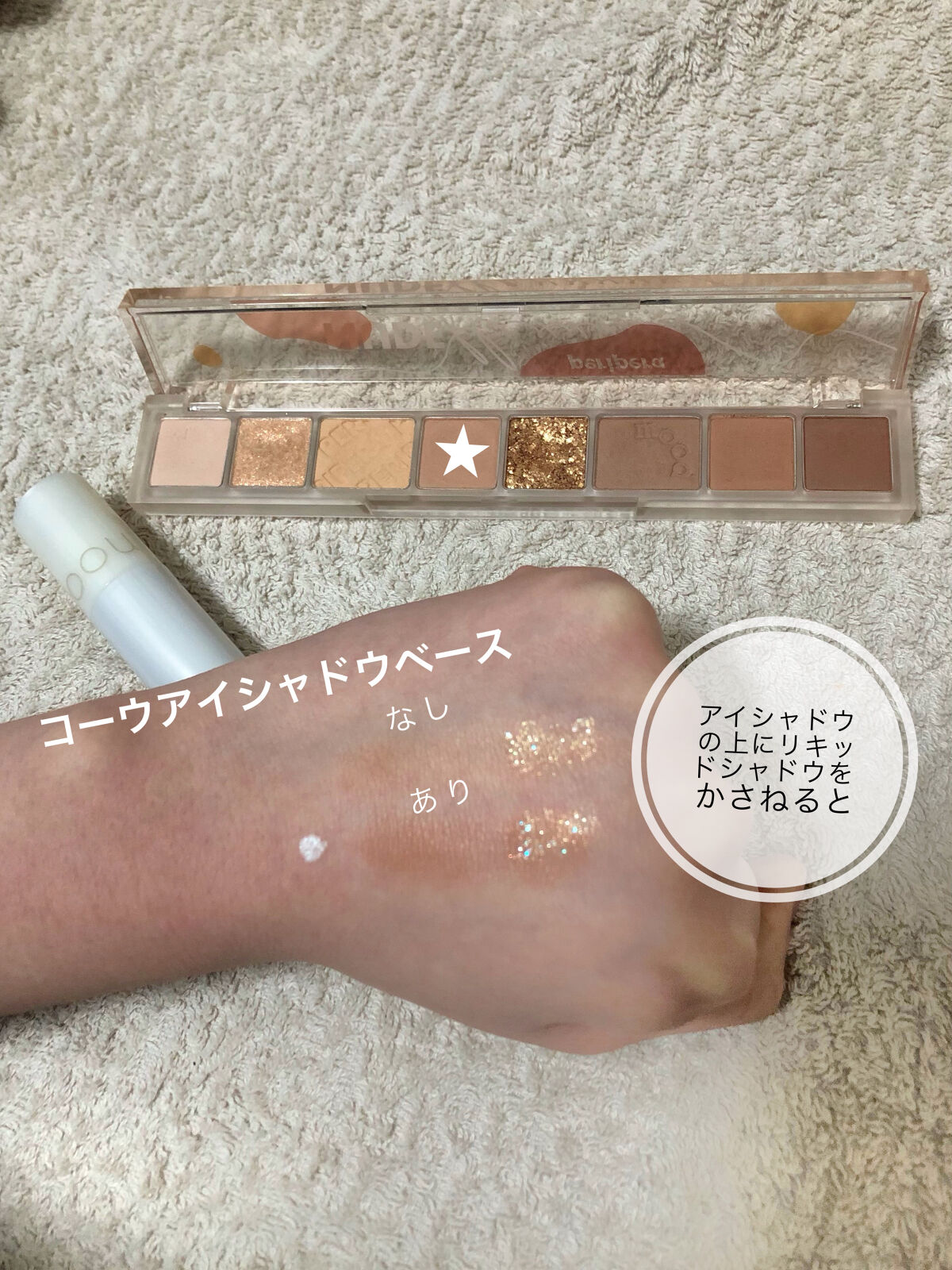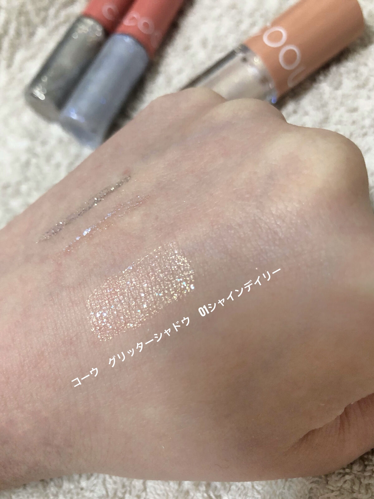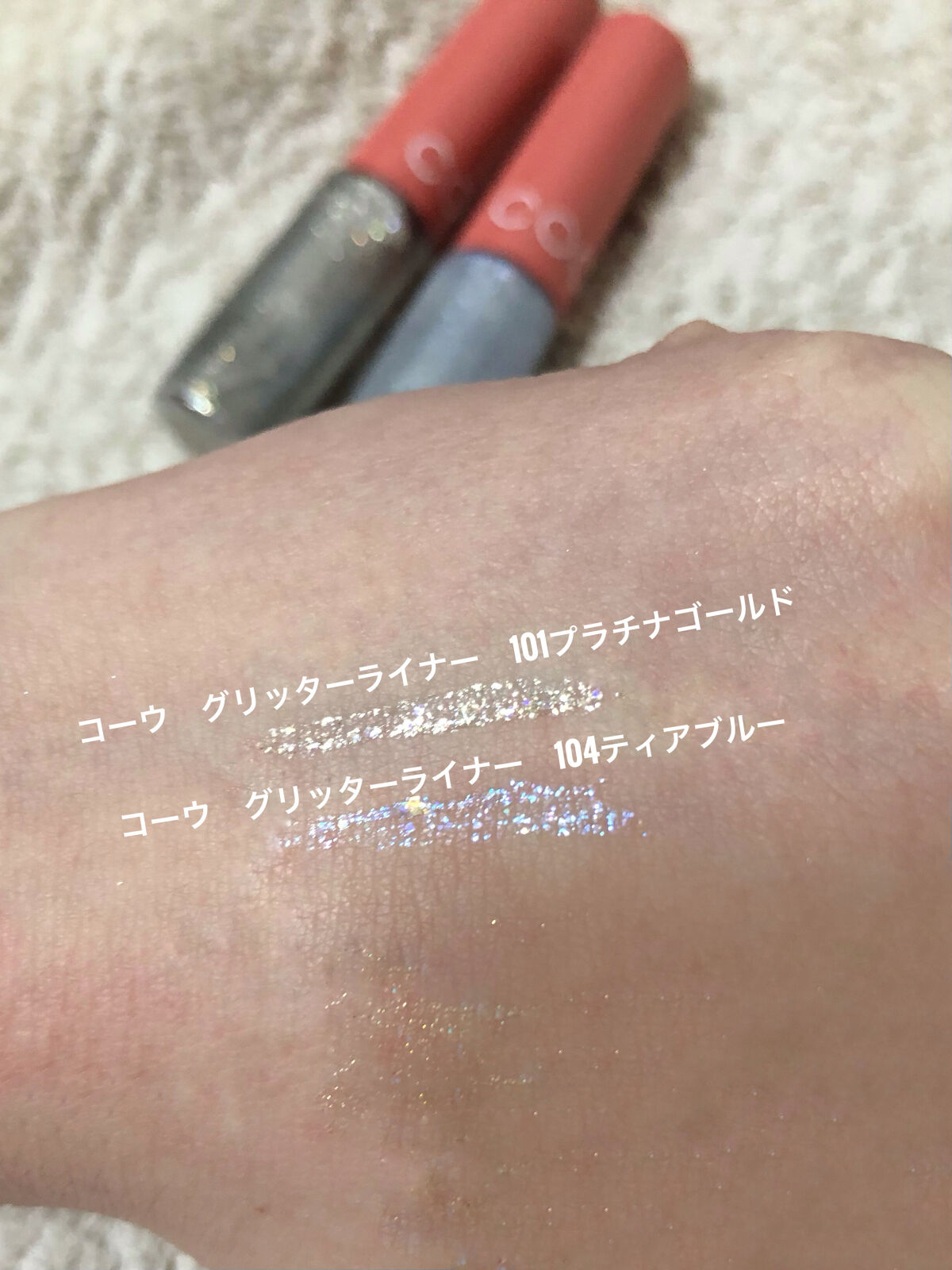 コーウ ハイライト 03ピンクライト ピンクのラメがちらちら光ってかわいい! コーウ スティックアイシャドウ 05ピンクシマー コーウはフラミンゴピンクにゴールドラメ コーウ グリッターライナー 101プラチナゴールド ゴールドラメとシルバーラメが(偏光ラメ?)が混ざって入っていてかわいい! コーウ グリッターライナー 104ティアブルー 細かいブルーラメと大きい偏光ラメがキラキラ コーウ リキッドアイシャドウ 01シャインデイリー 塗った直後は指でもスルスル伸びて塗りやすいのに、時間が経つとぴたっとくっついてくれる コーウ アイシャドウベース めちゃくちゃ少量でも伸びるのでこの写真の量だと両瞼の上下余裕で足りると思います アイシャドウにさっきのリキッドアイシャドウを重ねてみました ベースのアイシャドウの色味が透けて見えるのが可愛いし、使いやすそう