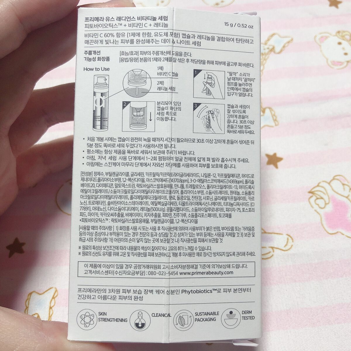 シルバーのボトルは、とってもオシャレ カプセルパートとセラムパートで分かれているのでふたを開け、カチッと音がするまでポンプを押し、最初に使用するときは、カプセルが溶けてセラムとよく混ざるように30秒以上、上下に振り、5分ほど立てておき、お肌になじませます。 ビタミンC+レチノールを実現したセラムはビタミンCカプセルとピュアレチノールの革新的な組み合わせで、毛穴や弾力などの肌の状態をケアし、健康的で美しい肌へと導くことができます。 やっぱり、別々に使ってたビタミンCとレチノールが一緒に使えるのはうれしい!