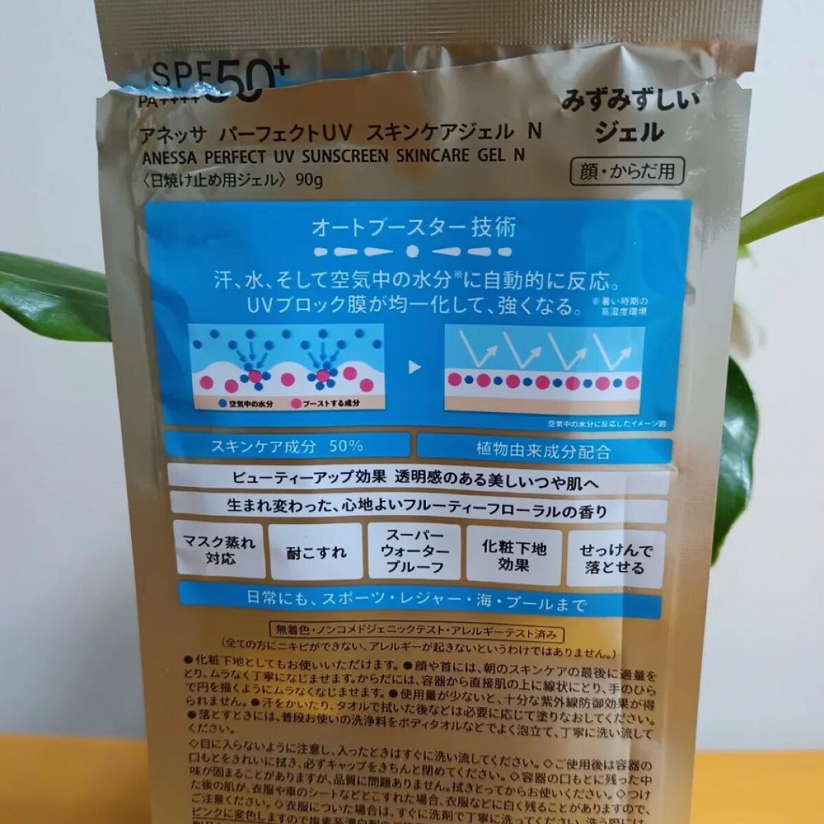 - SPF50+ ・ PA++++ 顔・ から だ用 汗、水、そして空気中の水分※10 に反応してUVブロック膜が強くなる技術搭載 毎日つけたくなる みずみずしいスキンケア UVジェル ※10 暑い時期の高湿度環境 〇汗、水、そして空気中の水分に自動的に反応して 、 UVブロック膜が 強くなります 。-オートブースタ ー 技術 〇透明美肌仕上げ-ビューティ ー アップ 〇スキンケア成分50%配合 〇保湿成分:コラーゲン、スーパーヒアルロン酸※9、グリセリン ※9 アセチルヒアルロン酸Na 〇長時間保湿持続効果 〇スーパーウォータープルーフ 〇マスク蒸れ対応 〇耐こすれ 〇化粧下地効果 〇せっけんで落とせる 〇みずみずしいジェル 〇生まれ変わった、心地よいフルーティーフローラルの香り 〇大気中に浮遊する微粒子、PM2.5などから肌を保護します。 -微粒子付着防止対応 〇海に流れ出にくいオーシャンフレンドリー処方※6 ※6 自社品内の耐水処方でない商品と比較 〇植物由来の原料を一部使用した袋 〇無着色・ノンコメドジェニックテスト・アレルギーテスト済み (全ての方にニキビができない、アレルギーが起きないというわけではありません)