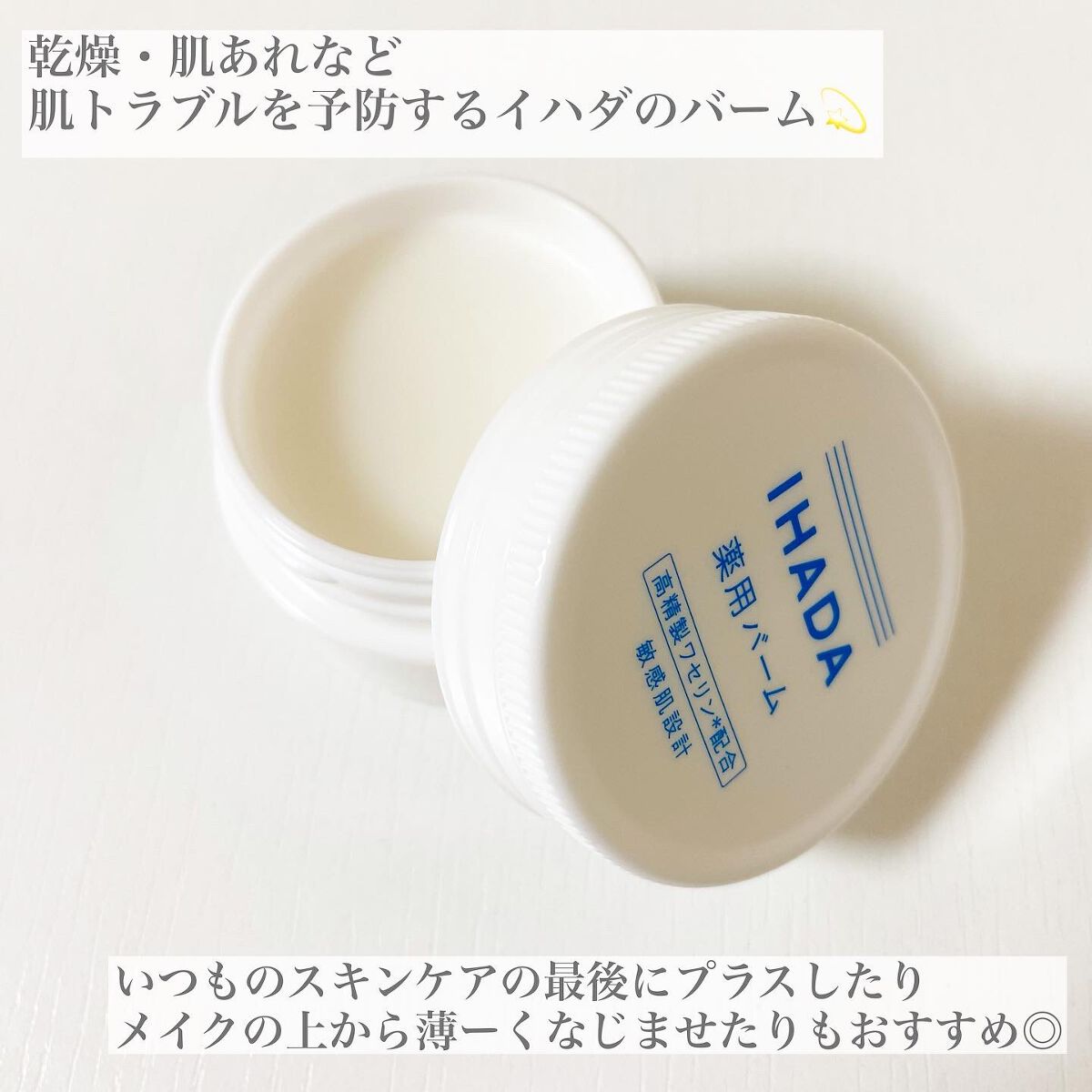 うるおい密閉してくれるIHADAの薬用バーム! とにかく低刺激で使いやすいです。 高精製ワセリン配合で乾燥などの外部刺激から守ってくれる 少量でとろけるように伸びてくれるバームでワセリン配合なのですが、べたつかずにしっかりと保湿してくれるのがお気に入りです!