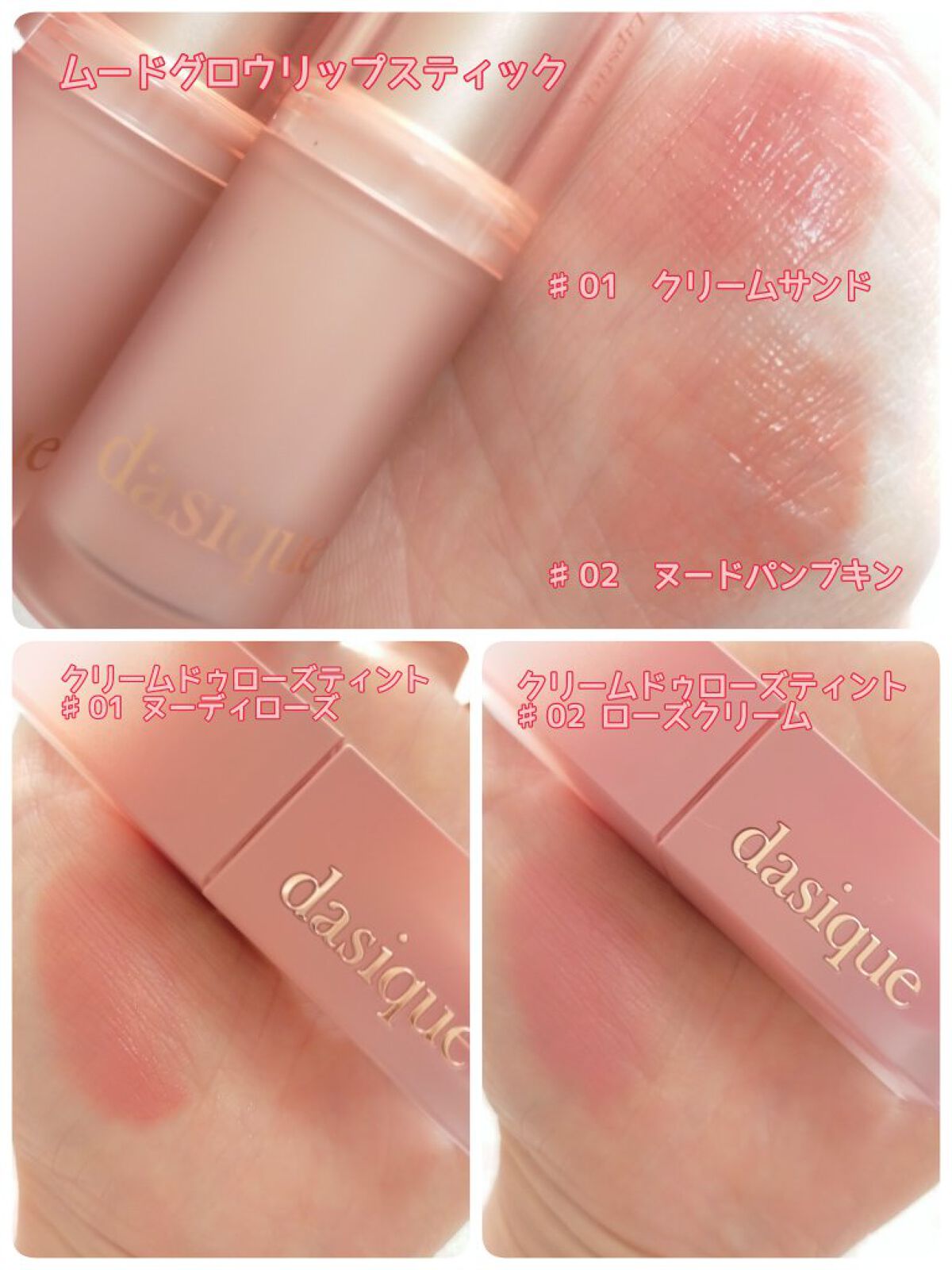 dasiqueミニシャドウパレットローズミルクティークリームドゥローズティント01 ヌーディーローズQoo10でメガ割前に購入したものです!アイシャドウは、ブルベカラーかな?と思ってたけど黄みも青みも強くなくて、けっこうニュートラルで、イエベ...