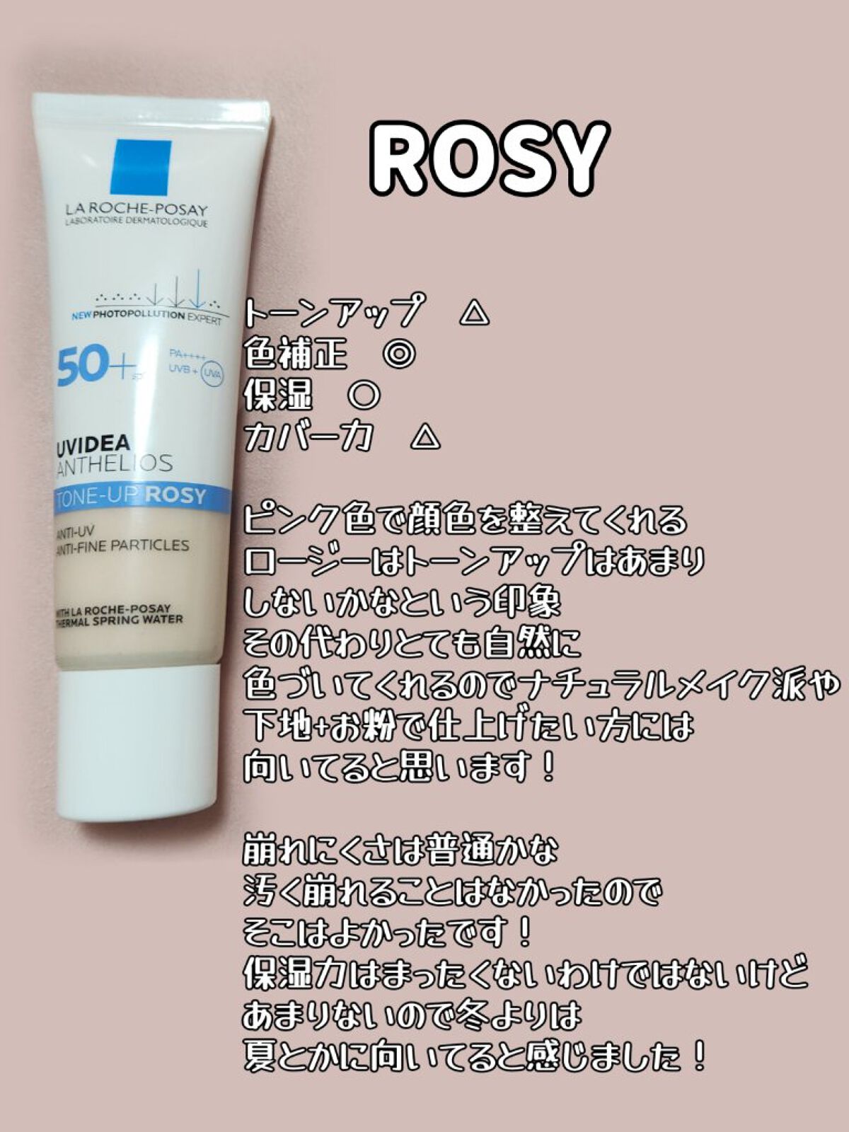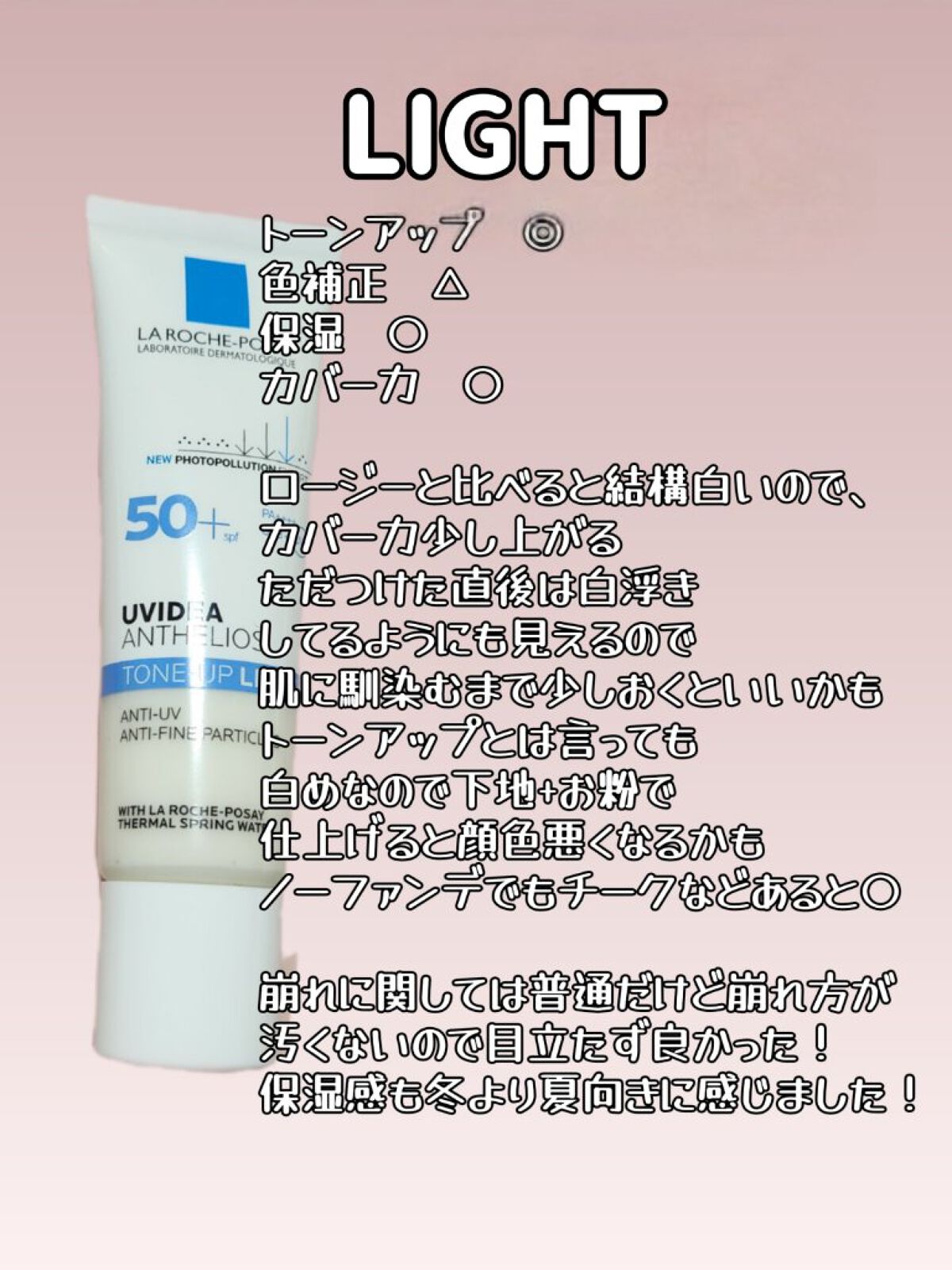 保湿力高めの下地が大好きなのでラロッシュポゼの下地はお気に入りでよく使います✨ かなりトーンアップします🤍自分は肌が黄ぐすみしやすいのでこれくらいトーンアップしてくれた方が時間がたった時にちょうどよくなります✨ 1番のお気に入りはローズです🌹肌から浮かない程よいトーンアップとほんのり血色感がよくなる所が大好きです🥰