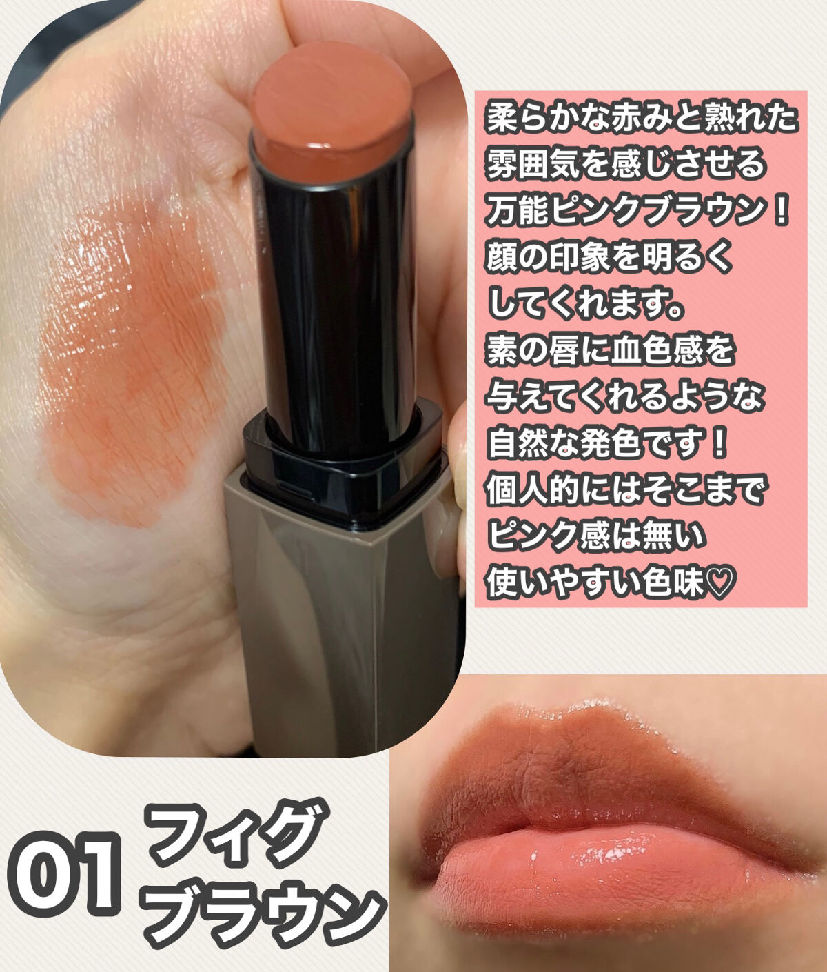 結構もったりとしたテクスチャーで、本当に保湿力は高いです!! 02 淡羽色 -AWAHANEIROはキャラメルベージュ。発色自体はそこまで強くはないかな?素の唇をオシャレヌーディな色にしてくれた感じ! 03 蜜込 -MITSUKOMEはイエロイッシュブラウン。けっこう黄味が強めのブラウンカラーで、個人的にはイエローオレンジブラウン!って感じで、ブラウン味はだいぶ控えめかなと🤔 ただ、個人的な注意点としては…03の色は塗ると、なぜかムラになりやすくて内側が綺麗につけれないなぁと思いました🤔 ケア効果・色・艶すべてを兼ね備えた素晴らしいリップです👏✨