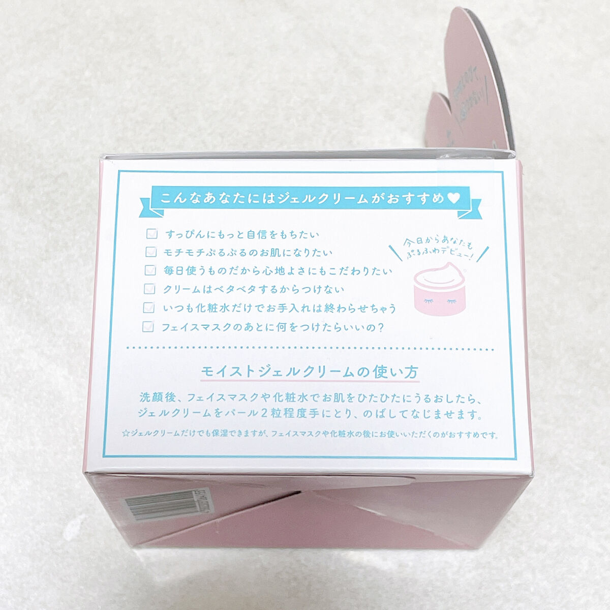 - 理想的な使用感と機能性を追求し、さらに進化したモイストジェルクリーム。ジェルのようにぷるぷるでクリームなのにふわっとかるいテクスチャーを実現。お肌のうるおいを閉じ込めるマイクロゲル構造と高保湿成分が長時間肌のうるおいを持続します。