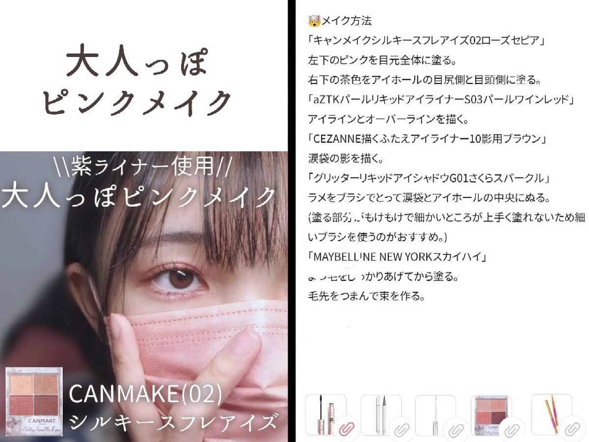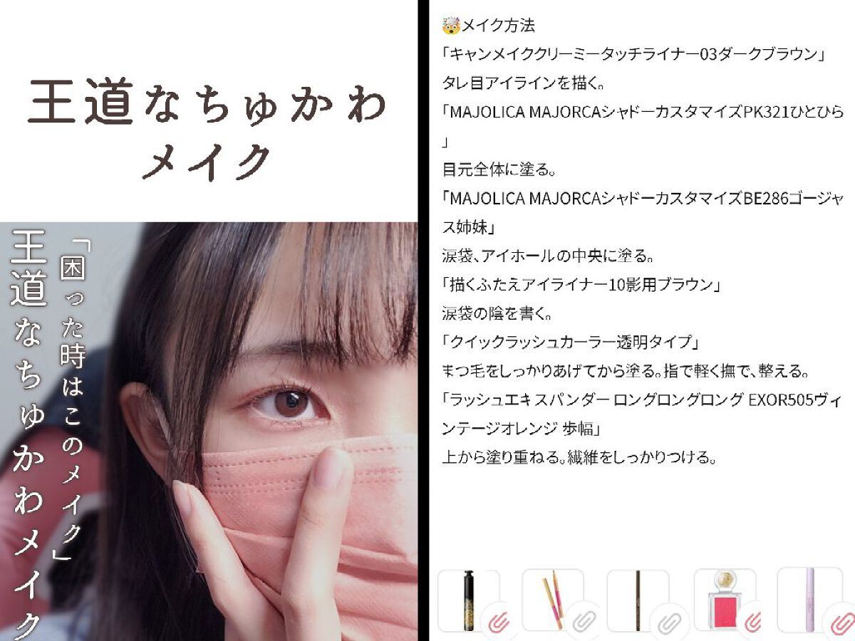 「キャンメイククリーミータッチライナー03ダークブラウン」 アイラインを描く。 「09ダージリンピンク」 オーバーラインと目頭切開ラインを描く。 「BLEND BERRYオーラクリエイション102ザクロ&シュガリーピンク」 右上の薄ピンクをアイホールと涙袋に塗る。(アイラインをぼかしながら) 右下の茶色を目尻に塗る。 「CEZANNE描くふたえアイライナー」 涙袋の影を描く。二重の線をなぞって二重の堀を深くする。 オーバーラインをなぞる。 「PERIPERAシュガー トゥインクル リキッド グリッター02SODAPOP FLAKES」 涙袋と目頭、アイホールの中央に塗る。(アイホールの中央はぼかす) 「キャンメイククイックラッシュカーラー透明タイプ」 まつ毛をしっかりあげてから塗る。爪で軽くつまみ束を作る。 「MAJOLICA MAJORCAラッシュエキスパンダー ロングロングロング EXOR505ヴィンテージオレンジ 歩幅」 毛先に塗り、指で整えて完成。(塗りすぎるとまつ毛の存在感が消えてしまうため塗りすぎ注意)
