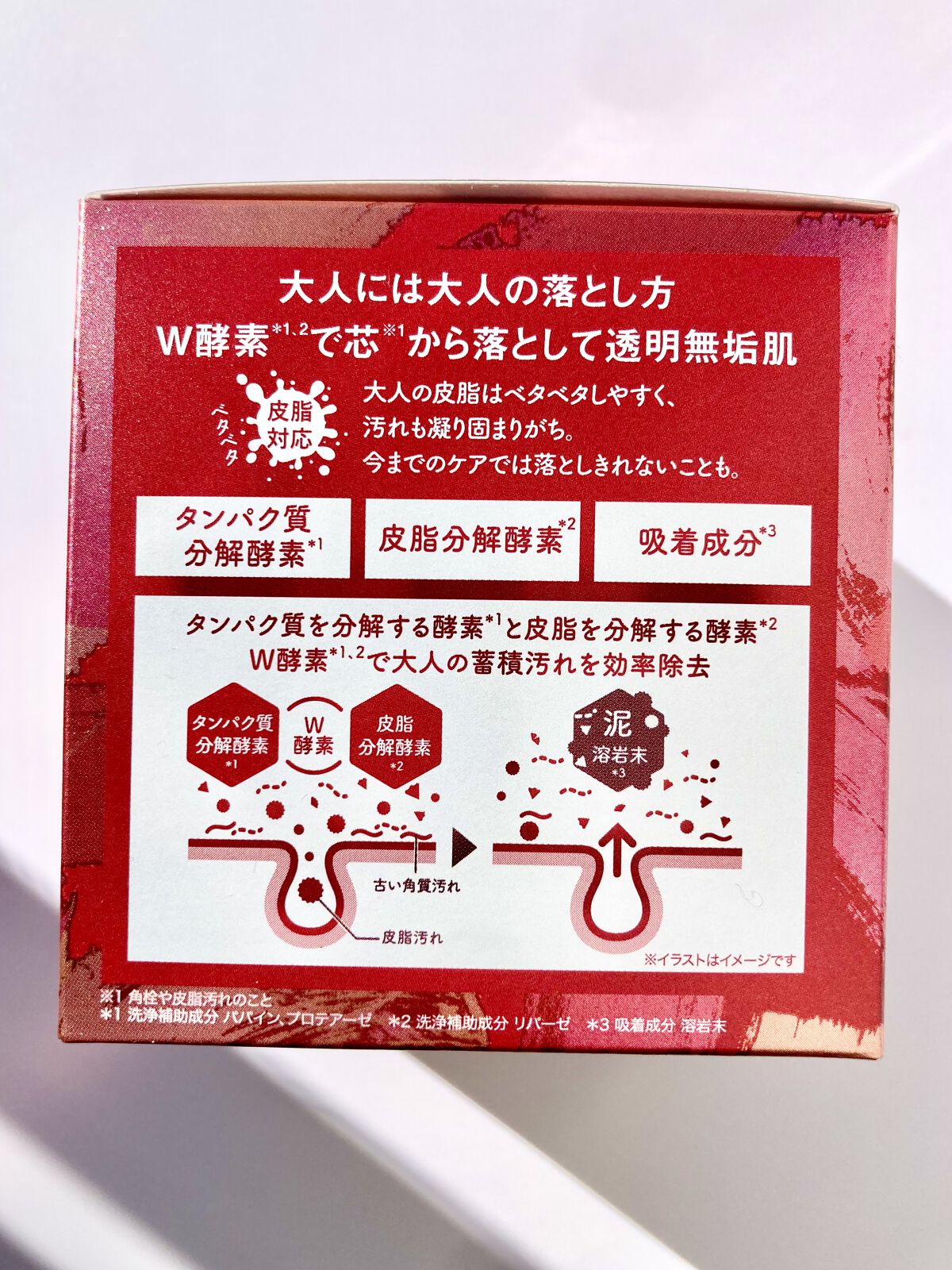 - 泥*1×W酵素*2で、エイジングサイン※1が気になる肌を土台※2から整えるクレンジングトーニングバーム。 細かい泥*1の粒子で、毛穴に詰まった汚れを吸着し、角栓を分解するダブルの酵素の力でくすみやごわつきの原因※3をすっきりつややかに落とします。※4 さらに大人の肌悩みに着目したエイジングケア※5成分として、ペプチド*3やナイアシンアミド*4、シアノコバラミン*5を配合し、すっきり無垢で若々しい、つやっとなめらかな素肌へ整えます。 厚みのあるバームが肌への摩擦を軽減。肌へやわらかく密着し、メイク汚れを包み込んで洗い流します。 乳化スピードがUP※6してすすぎやすく、洗い残しを防ぎます。 (※1 古い角質によるくすみやごわつきの蓄積のこと ※2 角質層のこと ※3 古い角質 ※4 泥、W酵素配合のバームで洗浄すること ※5 年齢に応じたケアのこと ※6 当社従来品比 *1 皮膚コンディショニング成分 溶岩末 *2 皮膚コンディショニング成分 プロテアーゼ、リパーゼ *3 整肌成分 加水分解ローヤルゼリータンパク *4 ハリ・ツヤ成分 *5 整肌成分)