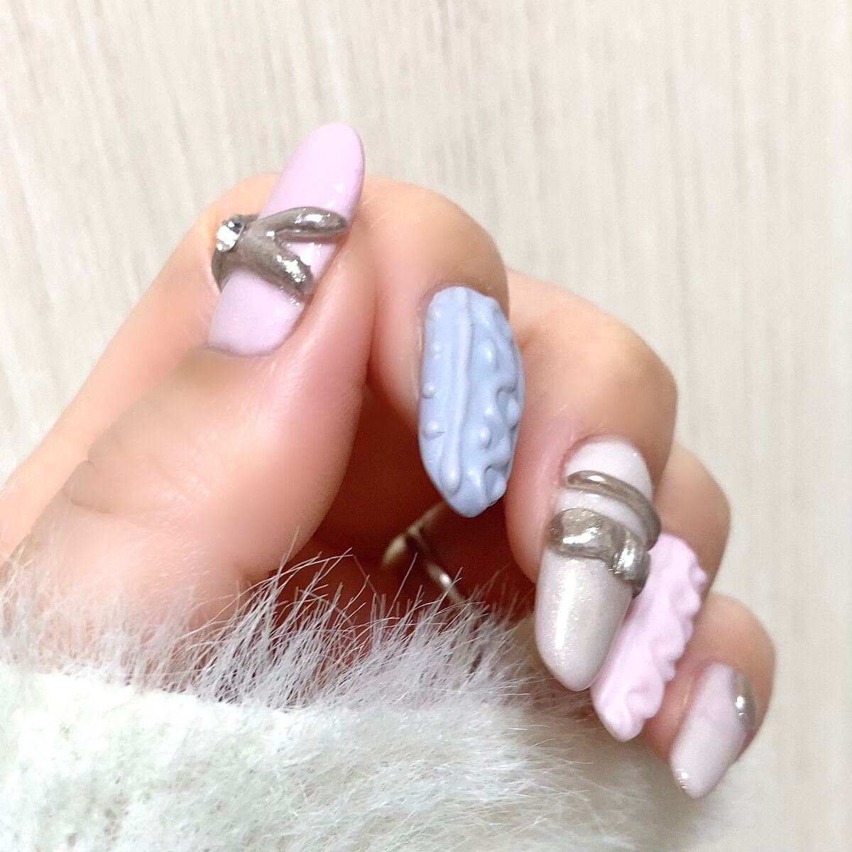 #セルフネイル記録♡夏っぽいブルー×シルバーのミラパアレンジ今回使ったのは・DAISOBRGジェルネイル(10ホワイト)・セリアジェルネイル(BlueGLAY)・NAILTOWNアイシングジェル(クリア)GALAXY(06)ニュアンスクロムパ...