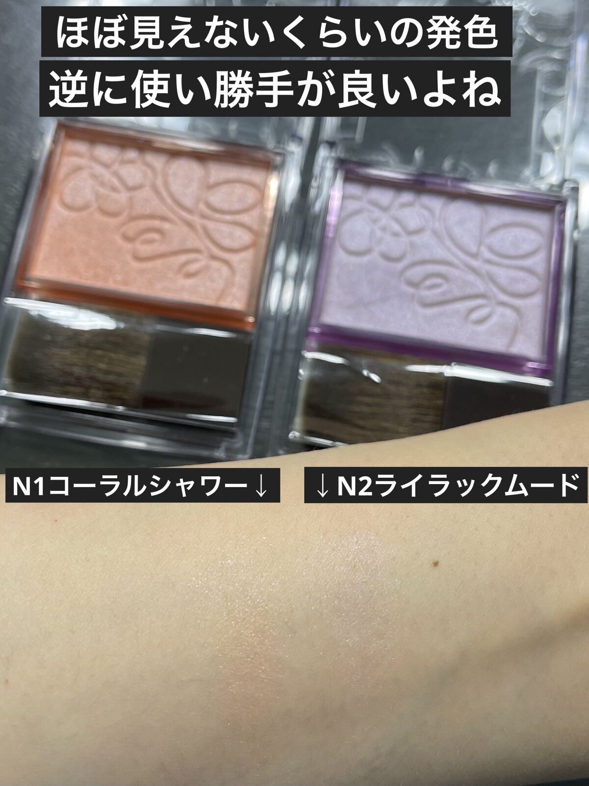 - <N1 コーラルシャワー> トリイソステアリン酸ポリグリセリル-2、トリエチルヘキサノイン、(フッ化/水酸化/酸化)/(Mg/K/ケイ素)、ヘキサ(ヒドロキシステアリン酸/ステアリン酸/ロジン酸)ジペンタエリスリチル、ミリスチン酸亜鉛、(HDI/トリメチロールヘキシルラクトン)クロスポリマー、ペンチレングリコール、ビスジグリセリルポリアシルアジペート-2、フェノキシエタノール、ハイドロゲンジメチコン、メチルパラベン、シリカ、トコフェロール、BG、水、ヒアルロン酸Na、カミツレ花エキス、ラベンダー花エキス、ローズマリー葉エキス、タルク、マイカ、酸化チタン、合成フルオロフロゴパイト、酸化鉄、酸化スズ、赤226、黄4、水酸化Al <N2 ライラックムード> トリイソステアリン酸ポリグリセリル-2、トリエチルヘキサノイン、(フッ化/水酸化/酸化)/(Mg/K/ケイ素)、ヘキサ(ヒドロキシステアリン酸/ステアリン酸/ロジン酸)ジペンタエリスリチル、ミリスチン酸亜鉛、(HDI/トリメチロールヘキシルラクトン)クロスポリマー、ペンチレングリコール、ビスジグリセリルポリアシルアジペート-2、フェノキシエタノール、ハイドロゲンジメチコン、メチルパラベン、シリカ、トコフェロール、BG、水、ヒアルロン酸Na、カミツレ花エキス、ラベンダー花エキス、ローズマリー葉エキス、タルク、合成フルオロフロゴパイト、酸化チタン、マイカ、グンジョウ、酸化スズ、酸化鉄、赤226、水酸化Al