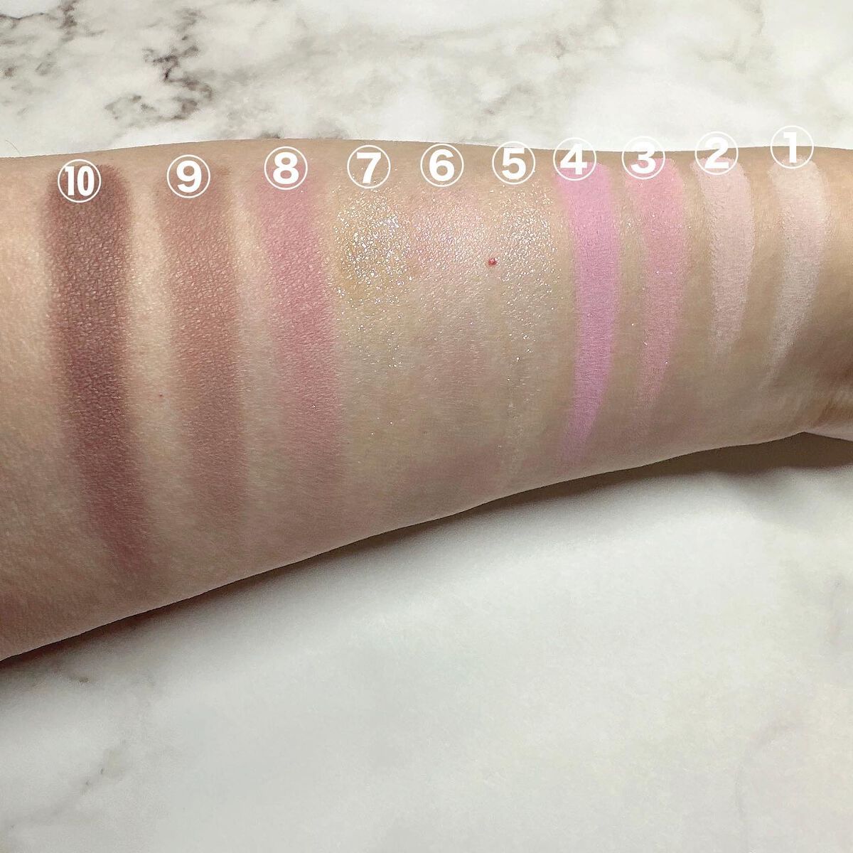 テクスチャーはサラサラだけど、飛び散るわけではなくて吸い付いてくる感じでした。 グリッターは、湿式のウェットさと押すとムニっとして、ちょっとゼリーテイストな気がします。ギラギラすぎなくて使いやすかったです。 ⑥はピンクも混ざっていてとても可愛い。アイスクリーム屋さんのストロベリーチーズケーキみたいな🍓これも、白すぎなくて肌馴染みの良い白系なので使いやすかったです。