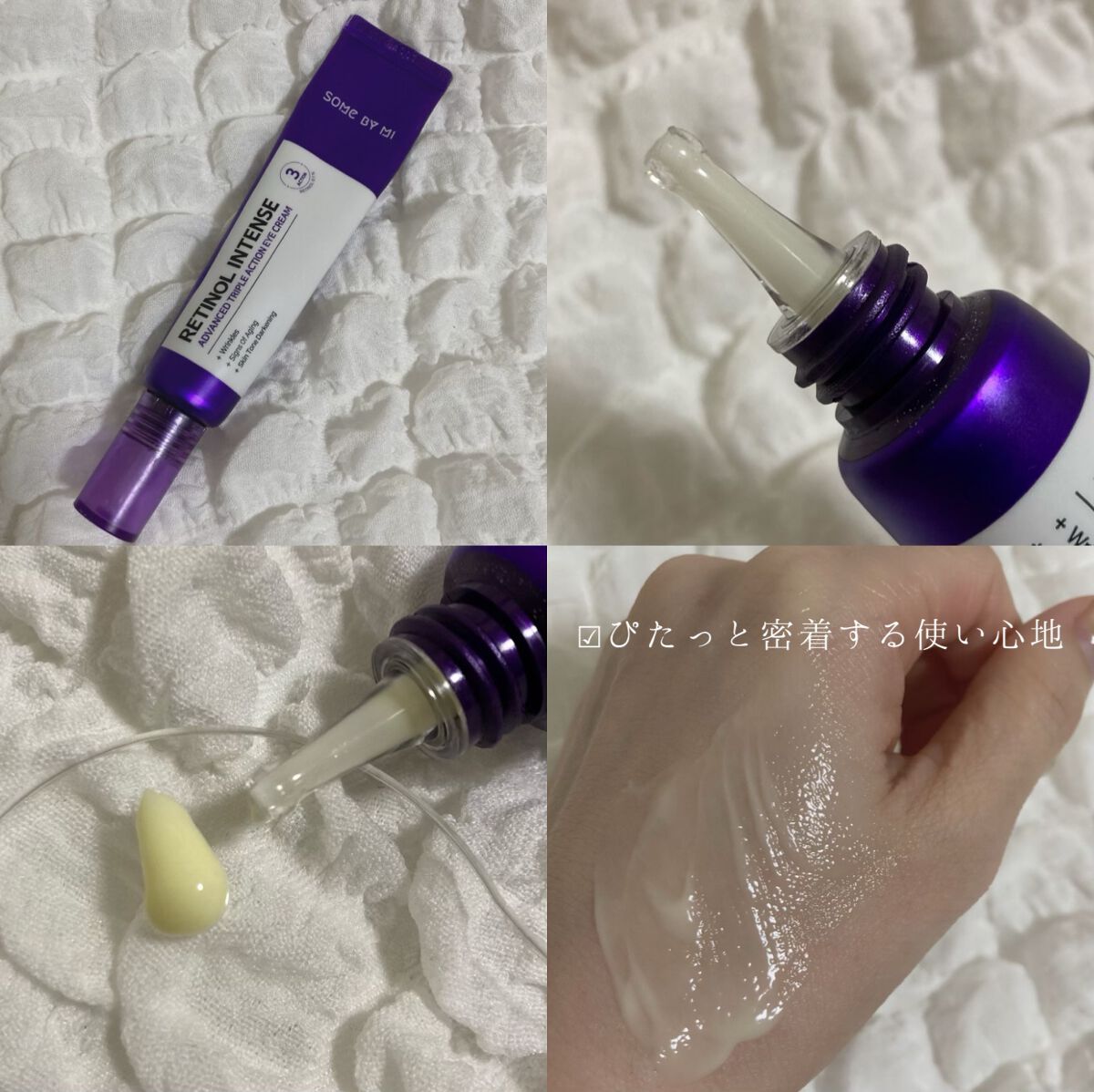 サムバイミーは、トラブル肌、敏感肌に注意を注いでいるスキンケアブランド☝️ そんなサムバイミーが作った、レチノール入りのアイクリームって👀⤴️⤴️ レチノール0.1%+グルタチオン配合で、レチノール入りなのに初心者でも使いやすい😆 クリーム色の、滑らかなクリーム状テクスチャー😌 チューブの先が細く、少量も出しやすいし目元ケアしやすい⤴️