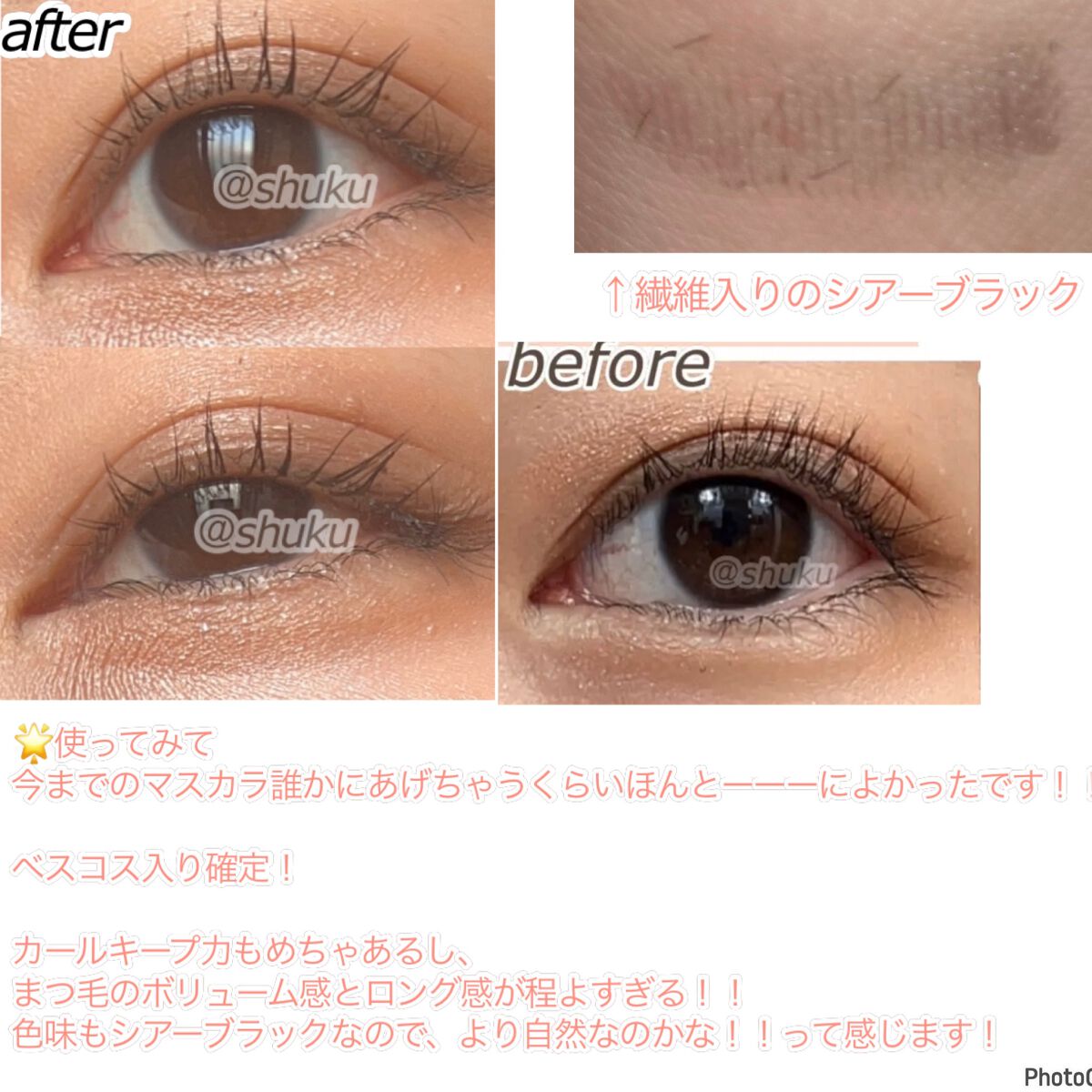 ブラシは少し太めでカーブしてるタイプ 塗りやすく長さがでる! 少しだけボリュームもアップ! 帰ってから少しだけ滲んでいました キープ力は6時間後でこんな感じ! 真正面見るとまつ毛が少ししか見えない位置に ブラシは細くてストレートタイプ。 繊細なまつ毛を演出 これが一番自然に伸びている感じ! ボリューム感は一番少ない! 少量で少しずつ伸びる感じだから、何回もマスカラ液つけてはまつ毛につけての 工程がいつもより長いからちょっとそこが気になるかな けど、ブラシが小さいから端の端までできる ブラシは太くて短めのタイプ。 少し塗りにくいかも あと、この中では唯一すこしダマもできる コームは必須マスカラ! ボリュームと程よいロング感! 仕上がりの好みはこれが一番好き!! キープ力は一緒くらい。