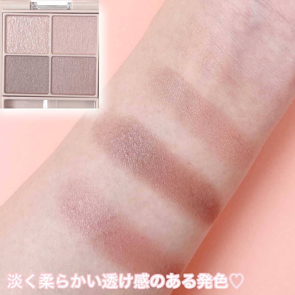 透明感溢れる4色構成のアイシャドウが肌なじみが良く艶っとした仕上がりで使うとはまってしまいます😍♥️♥️ お値段も¥825とお試ししやすい価格になっているので是非ぜひcheckしてみてくださいね!!😌 透けるラメ×透けるマットの組み合わせがとにかく可愛くてオシャレで1度使うと一軍アイシャドウの仲間入りになります✨✨