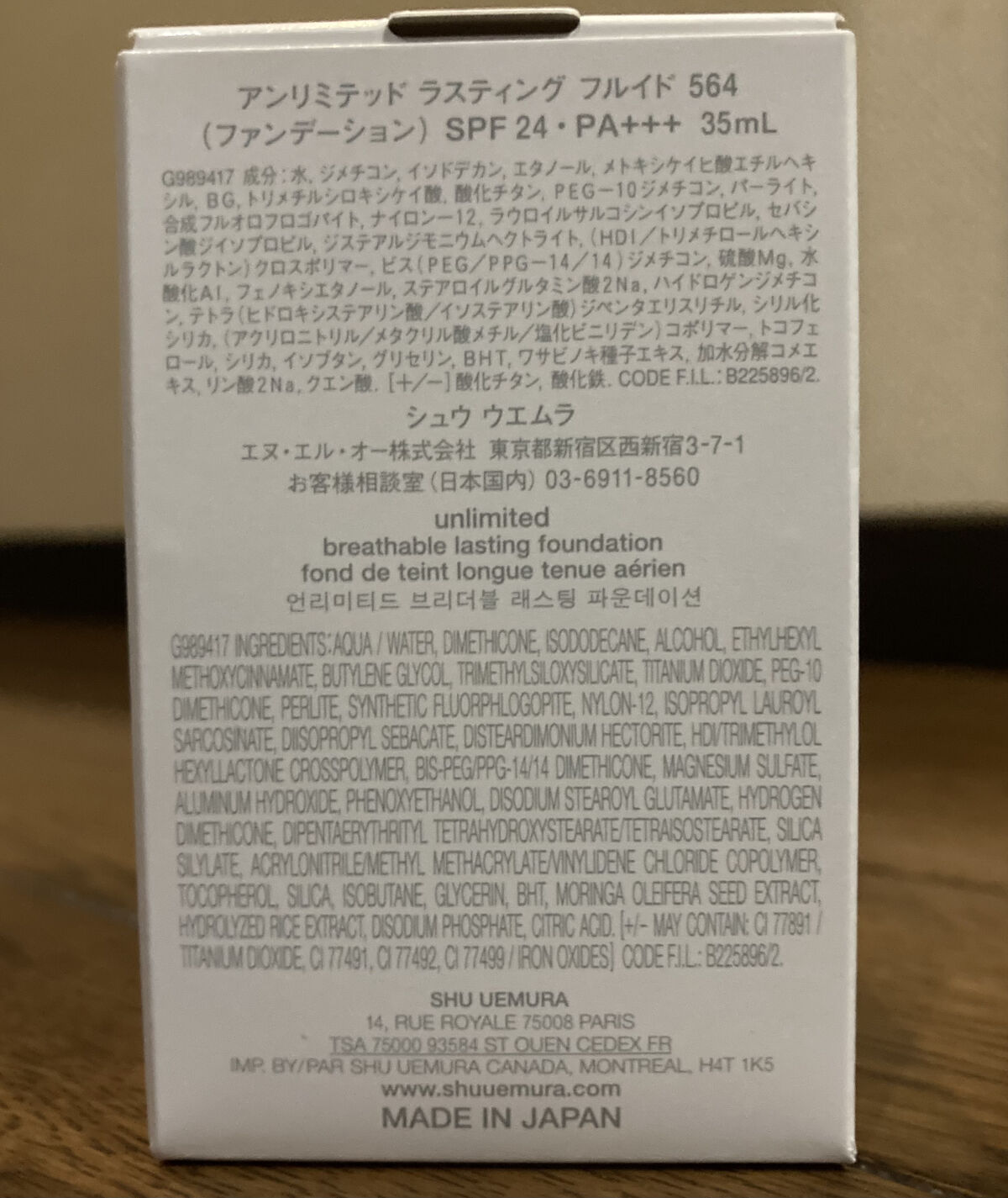 - <375> 水、ジメチコン、イソドデカン、エタノール、メトキシケイヒ酸エチルヘキシル、BG、トリメチルシロキシケイ酸、酸化チタン、PEG-10ジメチコン、パーライト、合成フルオロフロゴバイト、ナイロン-12、ラウロイルサルコシンイソプロピル、セバシン酸ジイソプロピル、ジステアルジモニウムヘクトライト、(HDI/トリメチロールヘキシルラクトン)クロスポリマー、ビス(PEG/PPG-14/14)ジメチコン、硫酸Mg、水酸化AI、フェノキシエタノール、ステアロイルグルタミン酸2Na、ハイドロゲンジメチコン、テトラ(ヒドロキシステアリン酸/イソステアリン酸)ジベンタエリスリチル、シリル化シリカ、(アクリロニトリル/メタクリル酸メチル/塩化ビニリデン) コポリマー、トコフェロール、シリカ、イソブタン、グリセリン、BHT、ワサビノキ種子エキス、加水分解コメエキス、リン酸2Na、クエン酸、〔+/-〕酸化チタン、酸化鉄 <453> 水、ジメチコン、イソドデカン、エタノール、メトキシケイヒ酸エチルヘキシル、BG、トリメチルシロキシケイ酸、酸化チタン、PEG-10ジメチコン、パーライト、合成フルオロフロゴバイト、ナイロン-12、ラウロイルサルコシンイソプロピル、セバシン酸ジイソプロピル、ジステアルジモニウムヘクトライト、(HDI/トリメチロールヘキシルラクトン)クロスポリマー、ビス(PEG/PPG-14/14)ジメチコン、硫酸Mg、水酸化AI、フェノキシエタノール、ステアロイルグルタミン酸2Na、ハイドロゲンジメチコン、テトラ(ヒドロキシステアリン酸/イソステアリン酸)ジベンタエリスリチル、シリル化シリカ、(アクリロニトリル/メタクリル酸メチル/塩化ビニリデン) コポリマー、トコフェロール、シリカ、イソブタン、グリセリン、BHT、ワサビノキ種子エキス、加水分解コメエキス、リン酸2Na、クエン酸、〔+/-〕酸化チタン、酸化鉄 <463> 水、ジメチコン、イソドデカン、エタノール、メトキシケイヒ酸エチルヘキシル、BG、トリメチルシロキシケイ酸、酸化チタン、PEG-10ジメチコン、パーライト、合成フルオロフロゴバイト、ナイロン-12、ラウロイルサルコシンイソプロピル、セバシン酸ジイソプロピル、ジステアルジモニウムヘクトライト、(HDI/トリメチロールヘキシルラクトン)クロスポリマー、ビス(PEG/PPG-14/14)ジメチコン、硫酸Mg、水酸化AI、フェノキシエタノール、ステアロイルグルタミン酸2Na、ハイドロゲンジメチコン、テトラ(ヒドロキシステアリン酸/イソステアリン酸)ジベンタエリスリチル、シリル化シリカ、(アクリロニトリル/メタクリル酸メチル/塩化ビニリデン) コポリマー、トコフェロール、シリカ、イソブタン、グリセリン、BHT、ワサビノキ種子エキス、加水分解コメエキス、リン酸2Na、クエン酸、〔+/-〕酸化チタン、酸化鉄 <474> 水、ジメチコン、イソドデカン、エタノール、メトキシケイヒ酸エチルヘキシル、BG、トリメチルシロキシケイ酸、酸化チタン、PEG-10ジメチコン、パーライト、合成フルオロフロゴバイト、ナイロン-12、ラウロイルサルコシンイソプロピル、セバシン酸ジイソプロピル、ジステアルジモニウムヘクトライト、(HDI/トリメチロールヘキシルラクトン)クロスポリマー、ビス(PEG/PPG-14/14)ジメチコン、硫酸Mg、水酸化AI、フェノキシエタノール、ステアロイルグルタミン酸2Na、ハイドロゲンジメチコン、テトラ(ヒドロキシステアリン酸/イソステアリン酸)ジベンタエリスリチル、シリル化シリカ、(アクリロニトリル/メタクリル酸メチル/塩化ビニリデン) コポリマー、トコフェロール、シリカ、イソブタン、グリセリン、BHT、ワサビノキ種子エキス、加水分解コメエキス、リン酸2Na、クエン酸、〔+/-〕酸化チタン、酸化鉄 <484> 水、ジメチコン、イソドデカン、エタノール、メトキシケイヒ酸エチルヘキシル、BG、トリメチルシロキシケイ酸、酸化チタン、PEG-10ジメチコン、パーライト、合成フルオロフロゴバイト、ナイロン-12、ラウロイルサルコシンイソプロピル、セバシン酸ジイソプロピル、ジステアルジモニウムヘクトライト、(HDI/トリメチロールヘキシルラクトン)クロスポリマー、ビス(PEG/PPG-14/14)ジメチコン、硫酸Mg、水酸化AI、フェノキシエタノール、ステアロイルグルタミン酸2Na、ハイドロゲンジメチコン、テトラ(ヒドロキシステアリン酸/イソステアリン酸)ジベンタエリスリチル、シリル化シリカ、(アクリロニトリル/メタクリル酸メチル/塩化ビニリデン) コポリマー、トコフェロール、シリカ、イソブタン、グリセリン、BHT、ワサビノキ種子エキス、加水分解コメエキス、リン酸2Na、クエン酸、〔+/-〕酸化チタン、酸化鉄 <534> 水、ジメチコン、イソドデカン、エタノール、メトキシケイヒ酸エチルヘキシル、BG、トリメチルシロキシケイ酸、酸化チタン、PEG-10ジメチコン、パーライト、合成フルオロフロゴバイト、ナイロン-12、ラウロイルサルコシンイソプロピル、セバシン酸ジイソプロピル、ジステアルジモニウムヘクトライト、(HDI/トリメチロールヘキシルラクトン)クロスポリマー、ビス(PEG/PPG