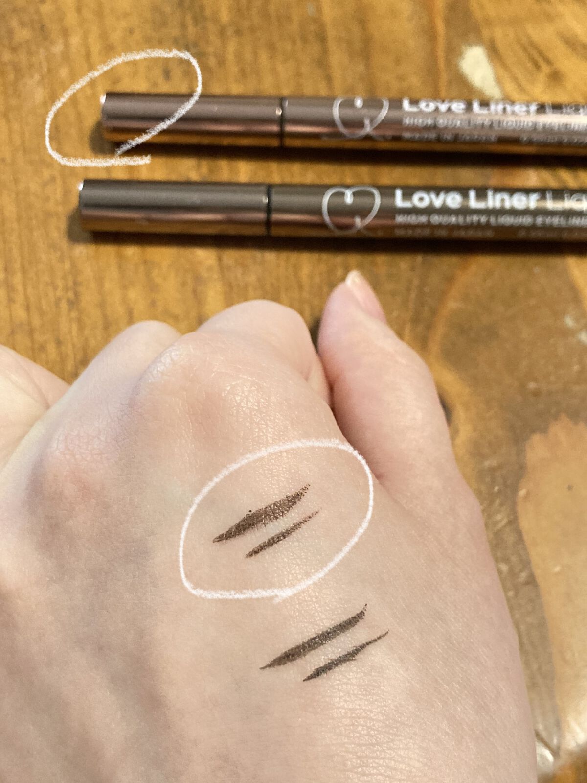 【使った商品】ラブ・ライナーリキッドアイライナーR5ダークブラウン通常版と極細筆の2種🖌️【商品の特徴】リニューアルした𝕃𝕠𝕧𝕖𝕃𝕚𝕟𝕖𝕣❤️🔥更に掠れにくくなって、筆の描きやすさも上がってる気がする!通常でも繊細な線がかけるのに、極細はも...