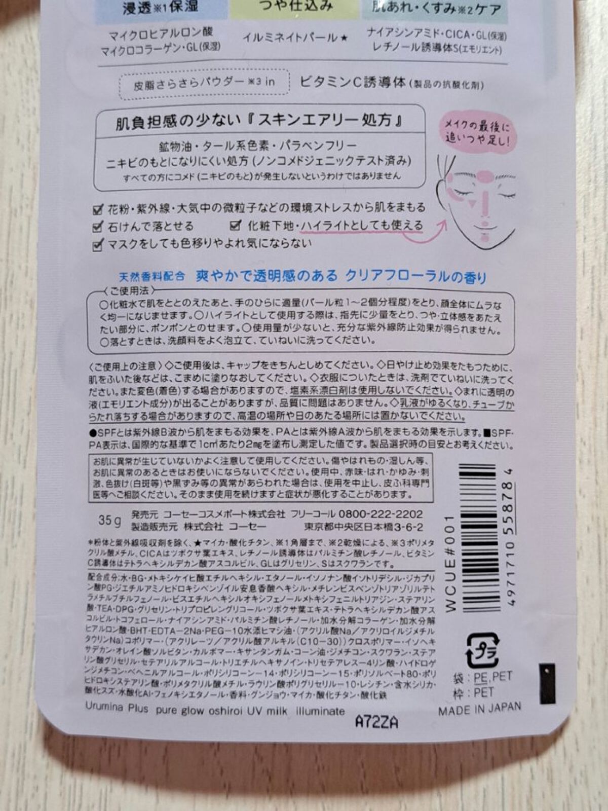 美容液75%配合ということもあって肌に乗せたてしっとりよ皮脂テカリ防止に皮脂さらさらパウダーが入っているからベタつかないところも好き私は乾燥肌だから普段のスキンケアの最後に日焼け止めとして使ってみたんだけどとっても良い感じ! スキンケアタッチで肌への負担少なく日焼け止めとして使えるところがとっても素敵ラベンダーカラーで色ムラを自然にカバーしてくれて毛穴、くすみ、凹凸もスキンケアタッチとイルミネイトパールで自然にカバー! このこほんっとに自然にカバーしてくれるの白浮きとかしないところほんとに素敵!細かいパールが肌を補正して見せてくれてこれだけで気分が上がるわ