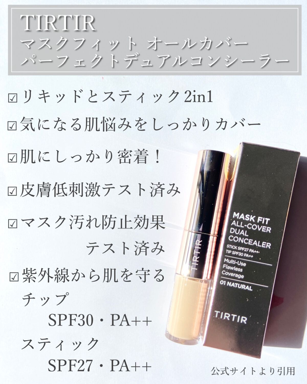 TIRTIRのオールカバーデュアルコンシーラーをいただきました🤍カラーは01NATURAL♡この商品はマスクフィットシリーズのオールカバーの姉妹品❤️ちなみに私はこのシリーズのクッションファンデを愛用してます♡2つ違うタイプのコンシーラーが1...
