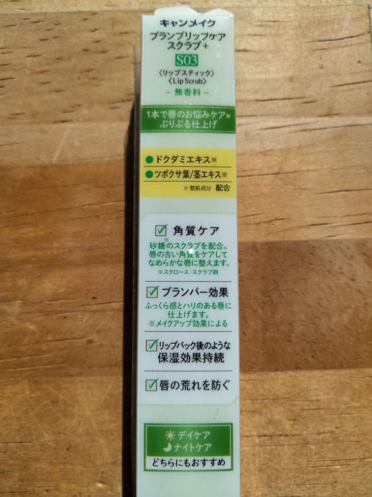 - うれしい成分をプラスした うるおい&角質ケアができるリップスクラブ S01…ヒアルロン酸Na(保湿成分)・セラミドNP(保湿成分) 配合 S02…ビタミンC誘導体(製品の抗酸化成分)・パルミチン酸レチノール(整肌成分) 配合 S03…ドクダミエキス(整肌成分)・ツボクサ葉/茎エキス(整肌成分) 配合 プランプリップケアスクラブに各色2種ずつ成分をプラスしたタイプ。 唇の上で溶けるお砂糖のスクラブが古い角質を優しくオフして、なめらかな唇に整えます。 リップパックした後のような高保湿が持続します。 拭き取り・洗い流し不要なので、外出先でも手軽にケアできます。 ナイトケアにもオススメです。 清涼感のある使い心地 ・スクラブ目的として砂糖の粒子を配合しておりますが、唇の状態によって刺激に感じられる可能性がございますのでご注意ください。 ・強くこすると刺激を感じることがあります。こすりすぎないように注意してください。 ・大変柔らかいバームですので、1㎜程度繰り出してお使いください。 ・一度繰り出したバームは戻りませんのでご注意ください。