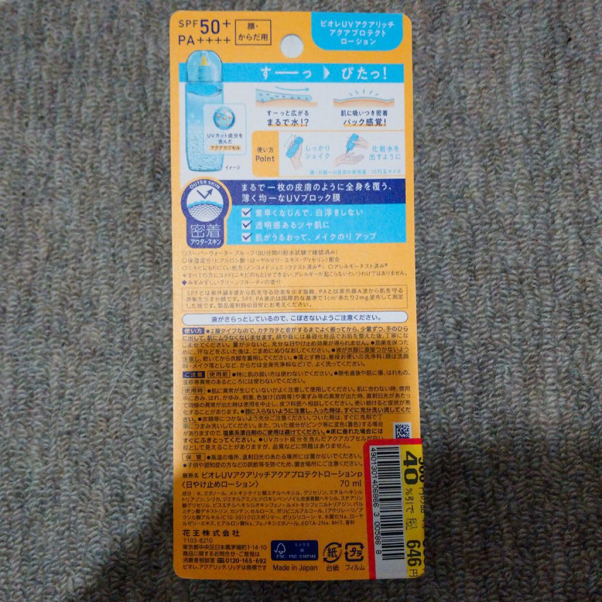 これから夏くるね…だからこそこいつで乗り切る!ビオレビオレUVアクアリッチアクアプロテクトローション水層パックレビュー前から爆バズりだったビオレUVアクアリッチアクアプロテクトローションを今更ながら購入してみました!振って使うタイプの日焼け止...