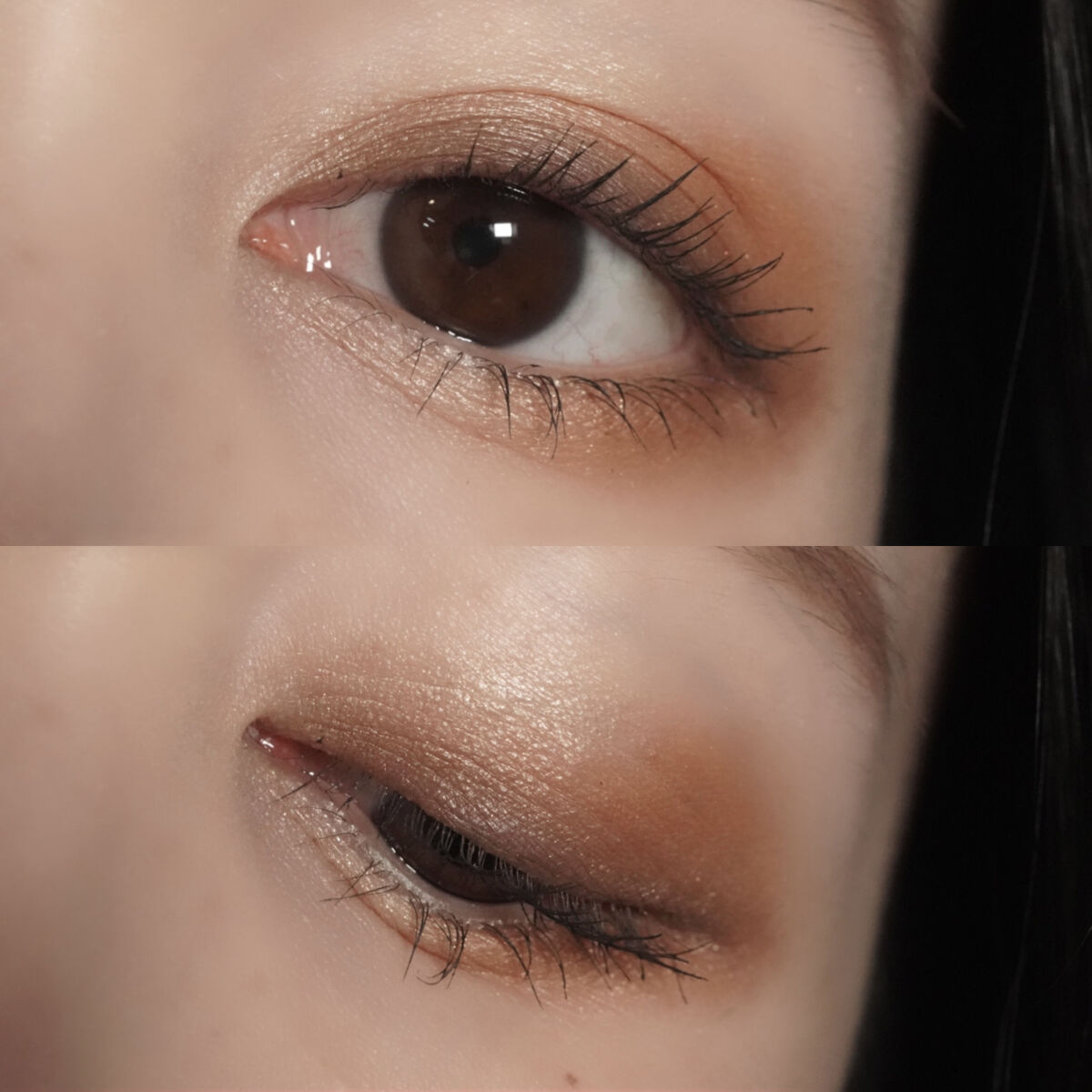 よくパレットのなかで明るいカラーをベースにまぶたに広く塗ることが多いのですが、パール感のあるカラーを避ける🙆♀️! パール感たっぷりの明るいカラーは涙袋に使うぐらい光を集めてぷっくり見せてくれるので、まぶたに広く使うと腫れぼったく見えがち😓 目元を明るくみせてくれたり、次に使うアイシャドウをぼかしやすくしてくれるけど、すっ飛ばしてメインのカラーを塗っちゃう✊🏻❤️🔥 涙袋にはたっぷり塗ってぷっくり見せる🙆♀️💕 シルキースフレアイズのマットタイプはすごく優れているな〜と感じました☺️💗 赤やオレンジなどは、入れすぎると腫れぼったく見えやすいので、見せたいカラーは下まぶた目尻にのせて色をたのしむ♡♡ パール感なしの透けマットだけじゃ物足りない… そう感じさせない華やかなラメが左上に入っているので黒目上と涙袋にのせるとすごく可愛い仕上がりに😍! 厄介な左右差のお陰でマットアイシャドウが好きになりました😌💕