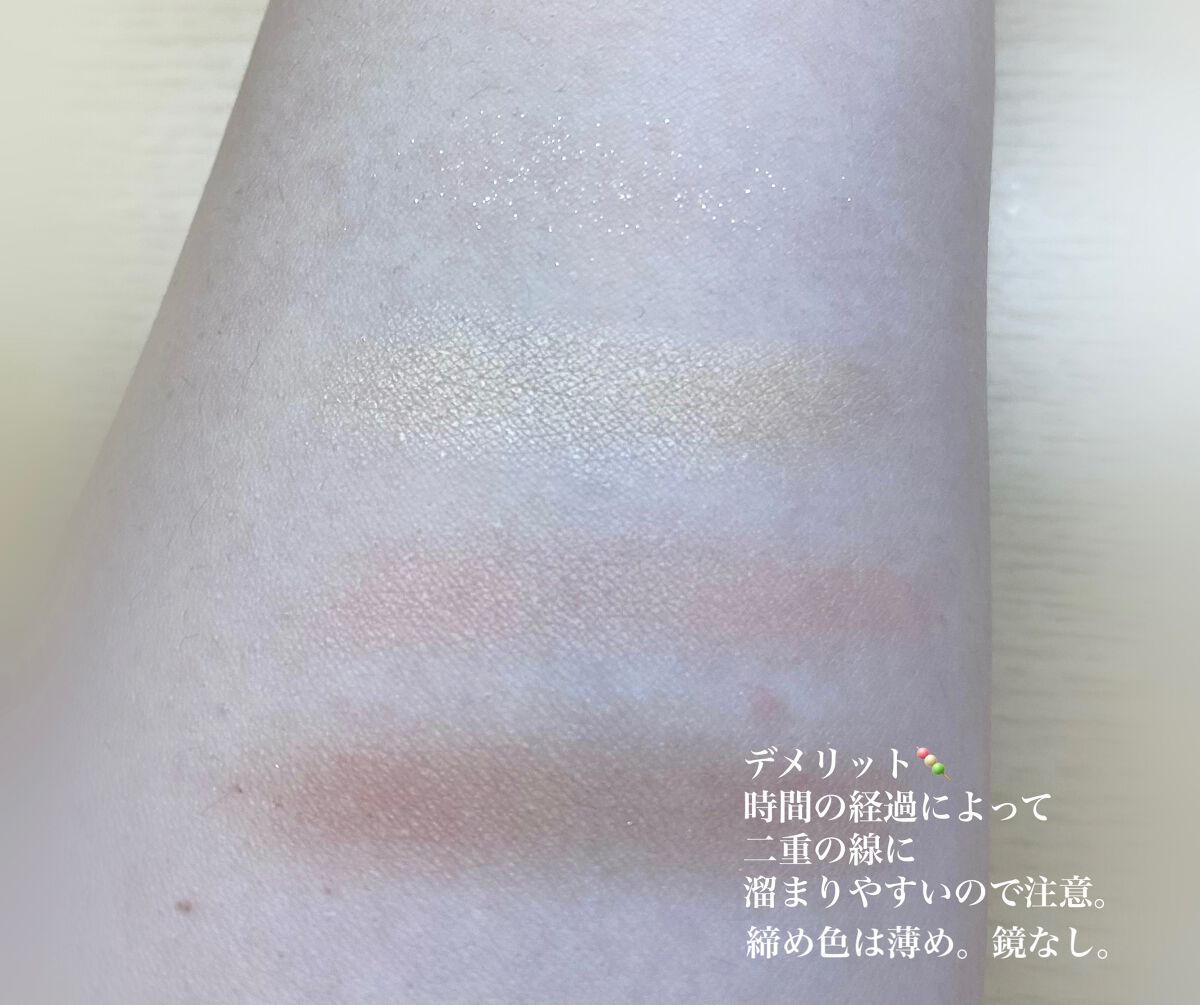 - ラメ・パール・マット3質感の4色アイシャドウ。 肌馴染みの良いベージュを基調としたカラー。ラメ・パール・マットの3質感を重ねて、自然にまぶたを強調し奥行のある大きな目元へ。 しっとり溶け込むような柔らかなパウダーなので、スルスル伸びてまぶたにピタッと密着。保湿成分(スクワラン・ホホバ種子油)配合。