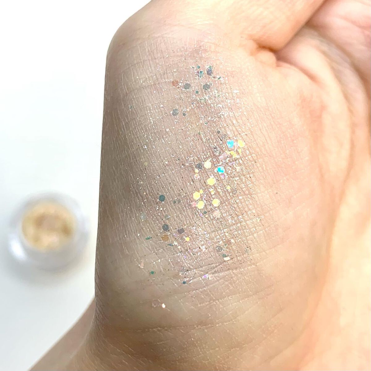 ビッグサイズのグリッターでとびきり輝くGlintのグリッタージェル✨ ウォータージェルフォーミュラで、アイメイクだけでなくチークやボディー、ヘアにも使用できちゃうマルチアイテムなんです🙌 ぽてっとしたジェリータイプのテクスチャーで、大粒のグリッターと細かいラメがぎっしり!光の下や角度によって煌めいて、ラメ好きさんにすごくおすすめ! ウォーターテクスチャーだからしっかり密着してラメ飛びも気になりませんでした。ただ、ラメが多いので落とす時ティッシュでは取りにくい⚡️