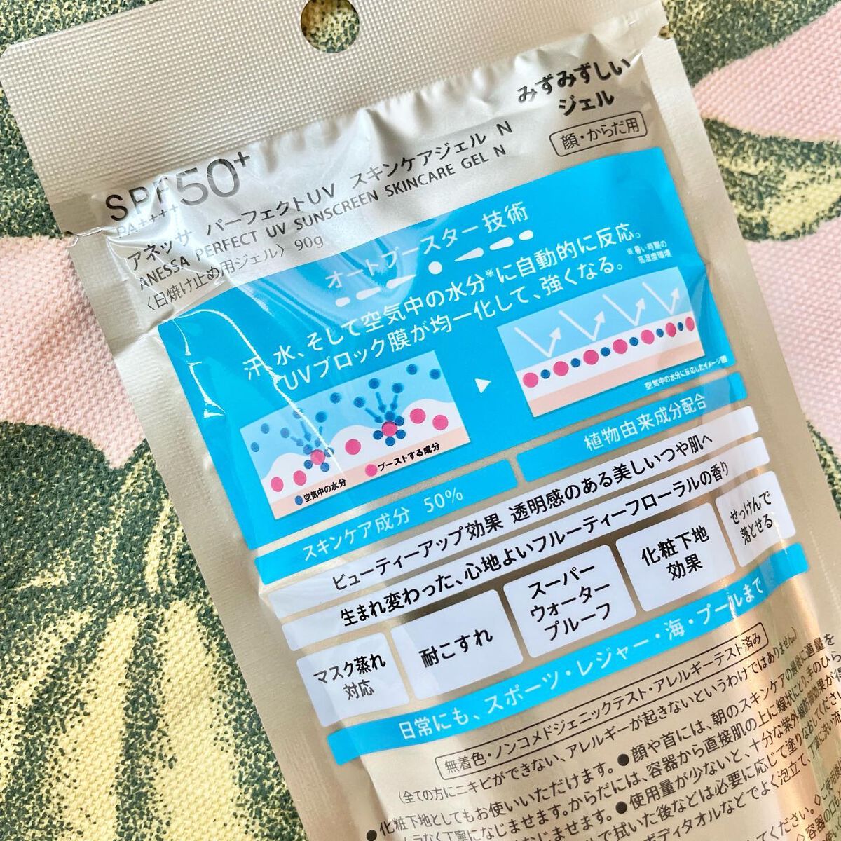 - SPF50+ ・ PA++++ 顔・ から だ用 汗、水、そして空気中の水分※10 に反応してUVブロック膜が強くなる技術搭載 毎日つけたくなる みずみずしいスキンケア UVジェル ※10 暑い時期の高湿度環境 〇汗、水、そして空気中の水分に自動的に反応して 、 UVブロック膜が 強くなります 。-オートブースタ ー 技術 〇透明美肌仕上げ-ビューティ ー アップ 〇スキンケア成分50%配合 〇保湿成分:コラーゲン、スーパーヒアルロン酸※9、グリセリン ※9 アセチルヒアルロン酸Na 〇長時間保湿持続効果 〇スーパーウォータープルーフ 〇マスク蒸れ対応 〇耐こすれ 〇化粧下地効果 〇せっけんで落とせる 〇みずみずしいジェル 〇生まれ変わった、心地よいフルーティーフローラルの香り 〇大気中に浮遊する微粒子、PM2.5などから肌を保護します。 -微粒子付着防止対応 〇海に流れ出にくいオーシャンフレンドリー処方※6 ※6 自社品内の耐水処方でない商品と比較 〇植物由来の原料を一部使用した袋 〇無着色・ノンコメドジェニックテスト・アレルギーテスト済み (全ての方にニキビができない、アレルギーが起きないというわけではありません)