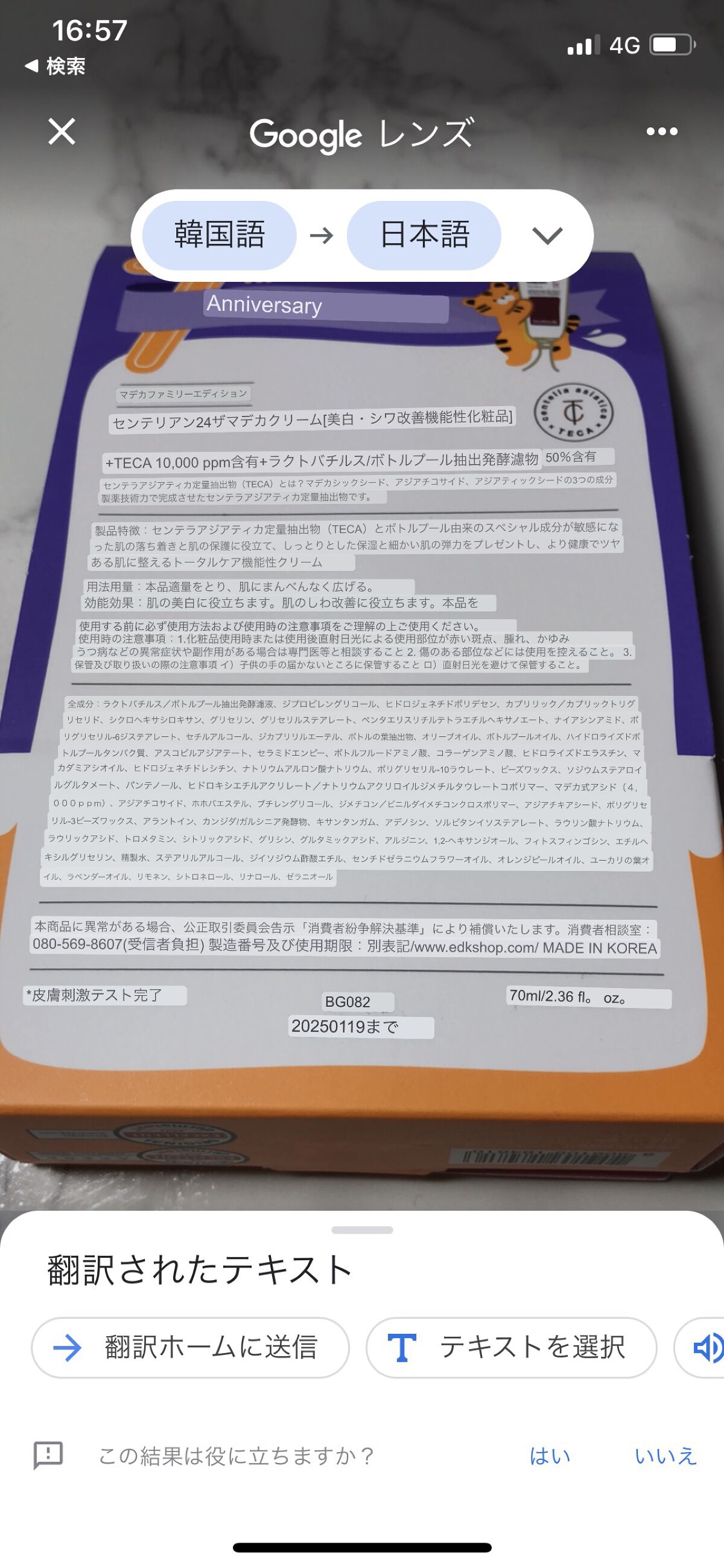 - <50ml> 乳酸菌/ツボクサ発酵エキス液、DPG、水ポリデセン、トリ(カプリル酸/カプリン酸)グリセリル、シクロヘキサシロキサン、グリセリン、テトラエチルヘキサン酸ペンタエリスリチル、ステアリン酸グリセリルナイアシンアミド、ジステアリン酸ポリグリセリルー6、セタノール、ジカプリリルエーテル、ラウリン酸ポリグリセリルー10、BG、1,2-ヘキサンジオール、水、ステアリルアルコール、ミツロウ、パンテノール、ステアロイルグルタミン酸Na、(アクリル酸ヒドロキシエチル/アクリロイルジメチルタウリン) コポリマーN a、マデカシン酸、アシアチコシド、ホホバエステル、オリーブ果実油、アシアチン酸、ヒドロキシアセトフェノン、ポリグリセリルー3ミツロウ、エチルヘキシルグリセリン、(ジメチコン/ ビニルジメチコン)クロスポリマー、ツボクサ油、アラントイン、カンジダ/ガルシニアカンボジア発酵物、キサンタンガム、ゼラニウム油、アデノシン、EDTA-2 Na、オレンジ果皮油、イソステアリン酸ソルビタン ユーカリ葉油、ツボクサ葉エキス、ラベンダー油、ラウリン酸N a、ラウリン酸、加水分解ツボクサタンパク質、マカデミア種子油、アシアチン酸アスコルビル、コラーゲンアミノ酸、セラミドNP、加水分解エラスチン、加水分解ツボクサエキス、トロメタミン、フィトスフィンゴシン、トコフェロール、水添レシチン、クエン酸、ヒアルロン酸N a、フェノキシエタノール、ソルビン酸K、グリシン、グルタミン酸、アルギニン