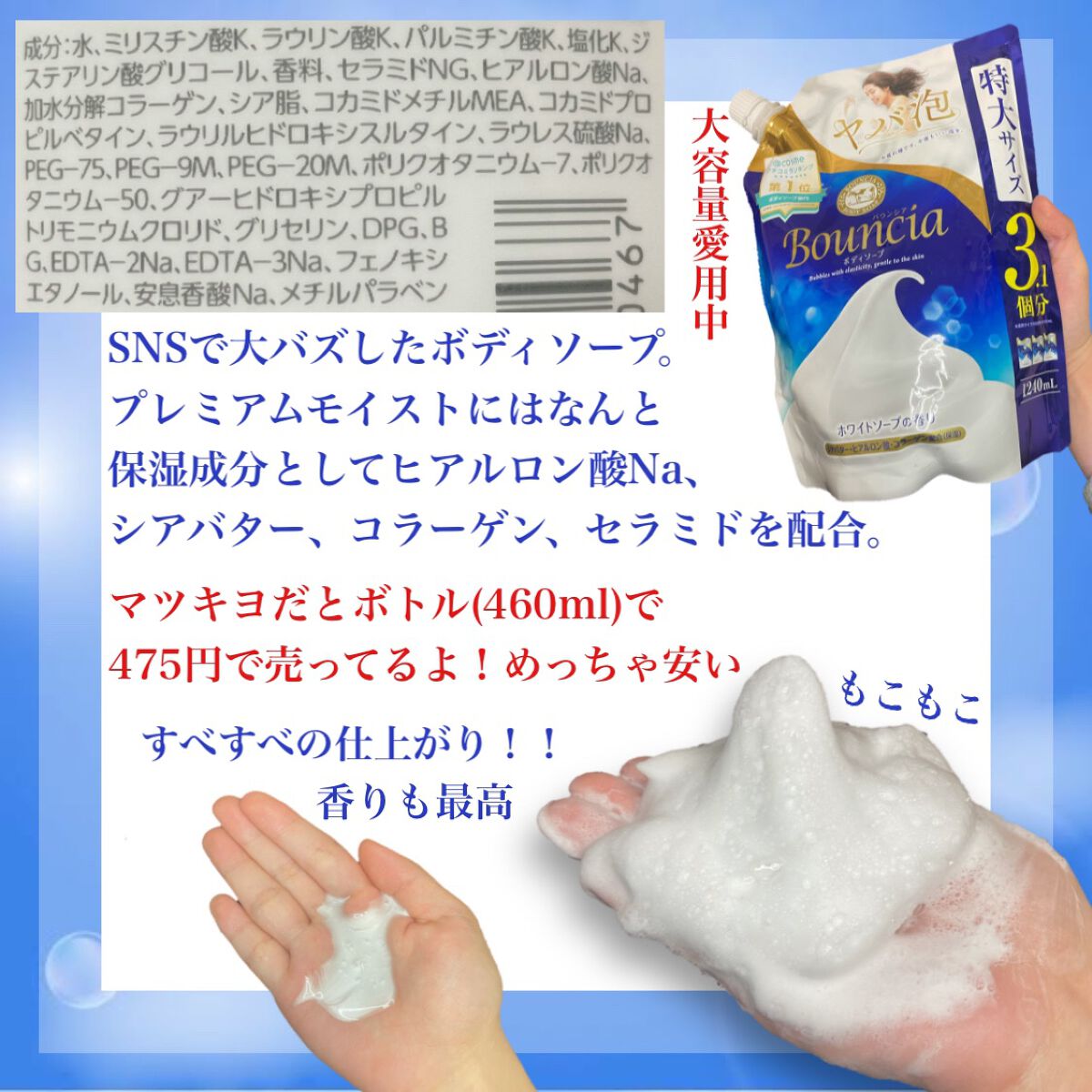 牛乳石鹸さまからいただきました🍼ˊ˗バウンシアボディソーププレミアモイスト上質なシルキーブロッサムの香りセラミド配合のプレミアムモイスト処方でしっとりタイプの濃厚クリーム泡ソープ🫧美肌成分セラミド¦シアバターヒアルロン酸¦コラーゲン(保湿)配...